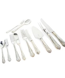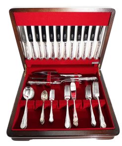 Umfangreiches Besteckset mit hochwertiger Versilberung in originaler Echtholzkassette. Das Besteck für 6 Personen enthält u.A. Vorlegebesteckteile, Kuchenheber, Kuchen – und Fischbesteck.