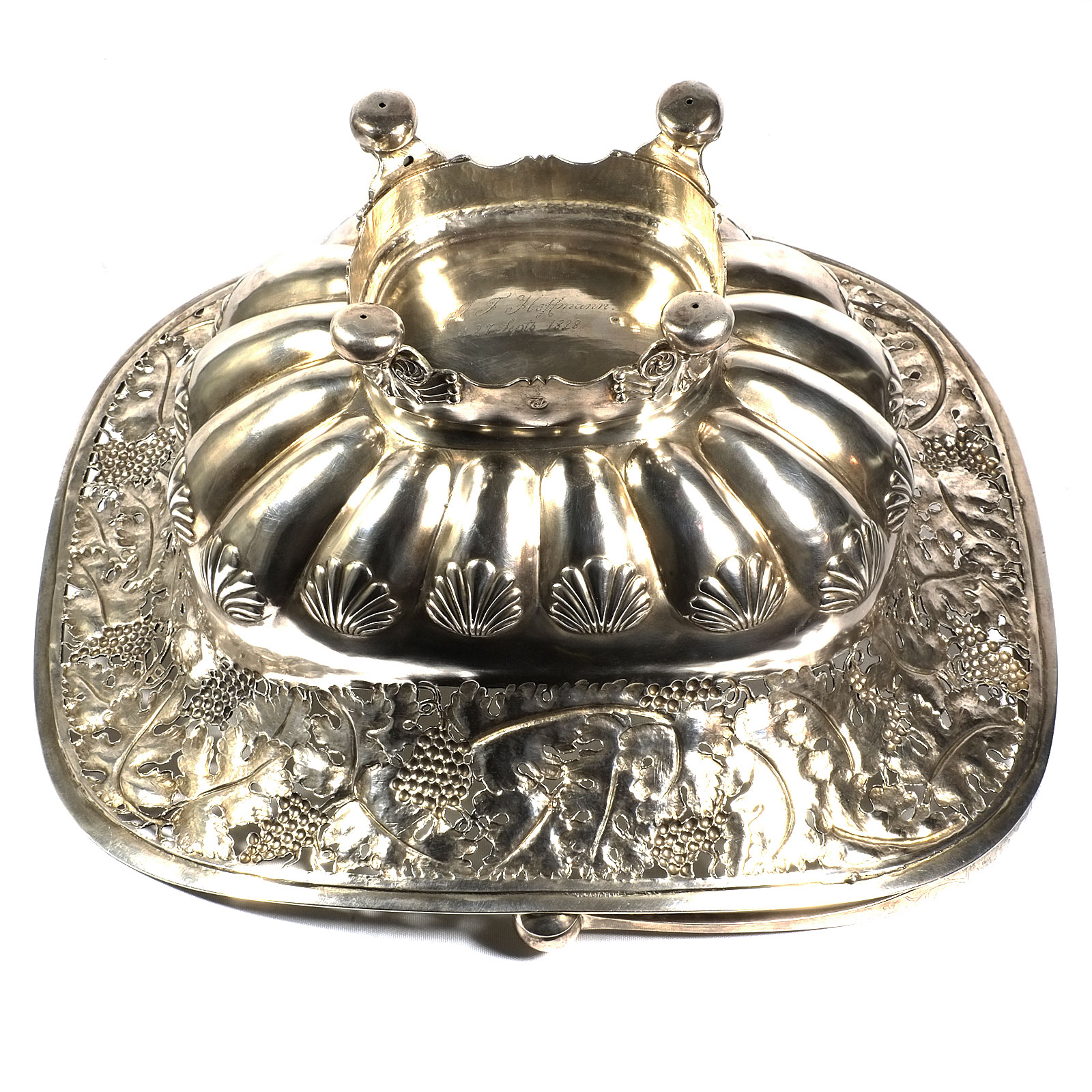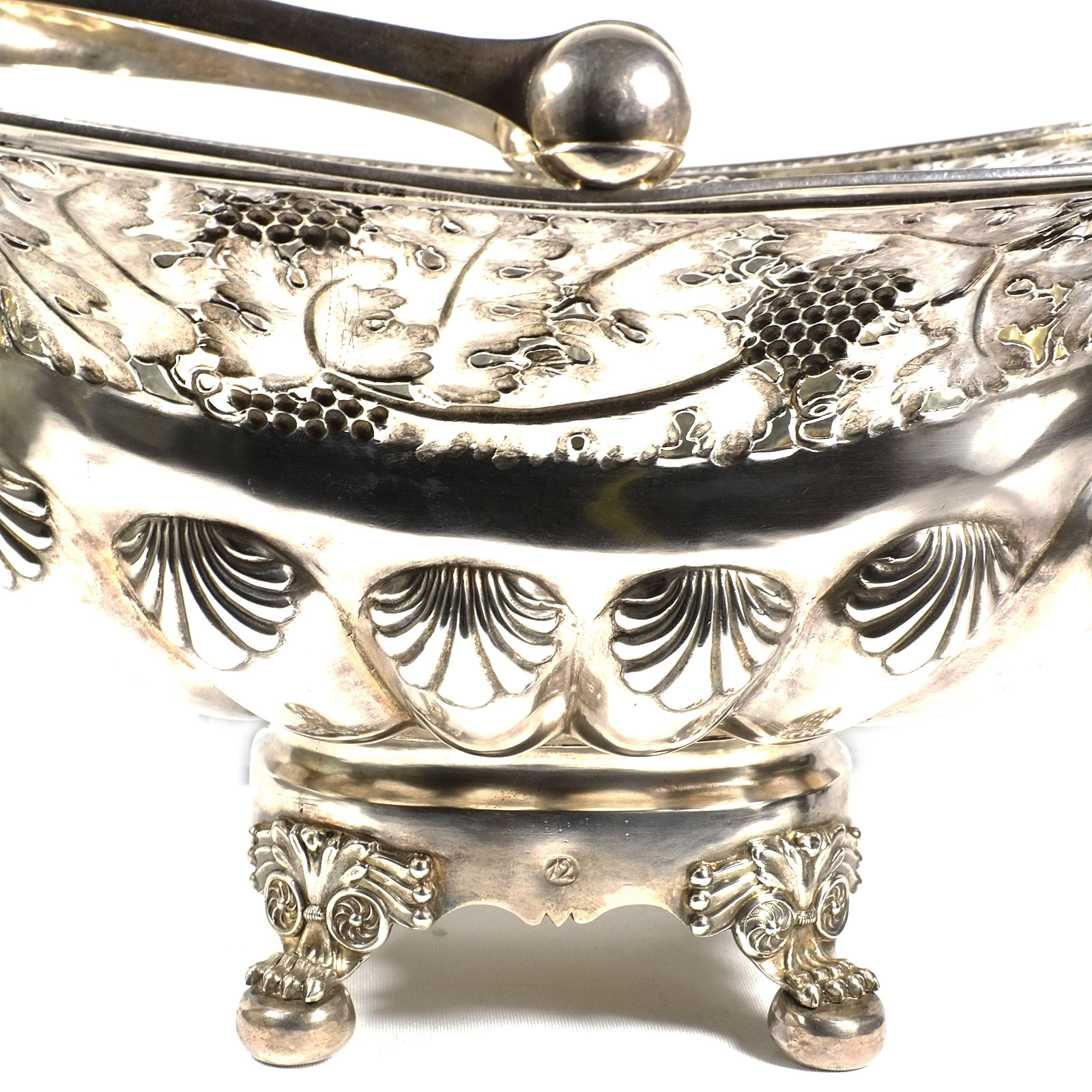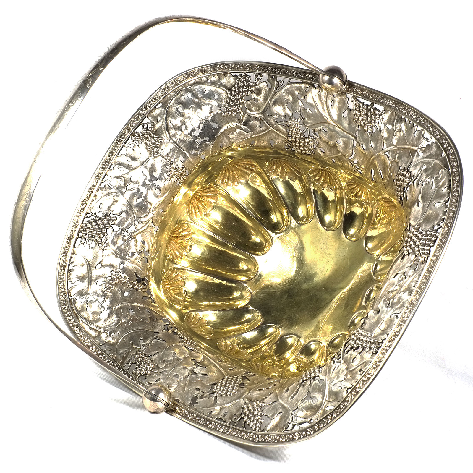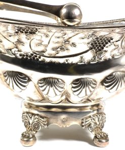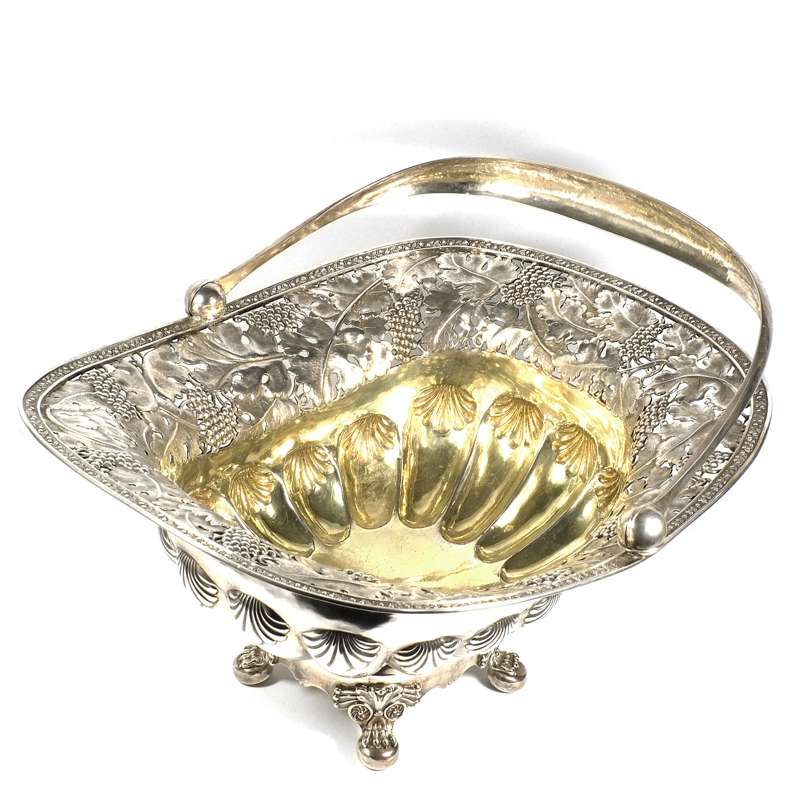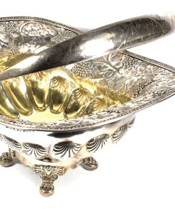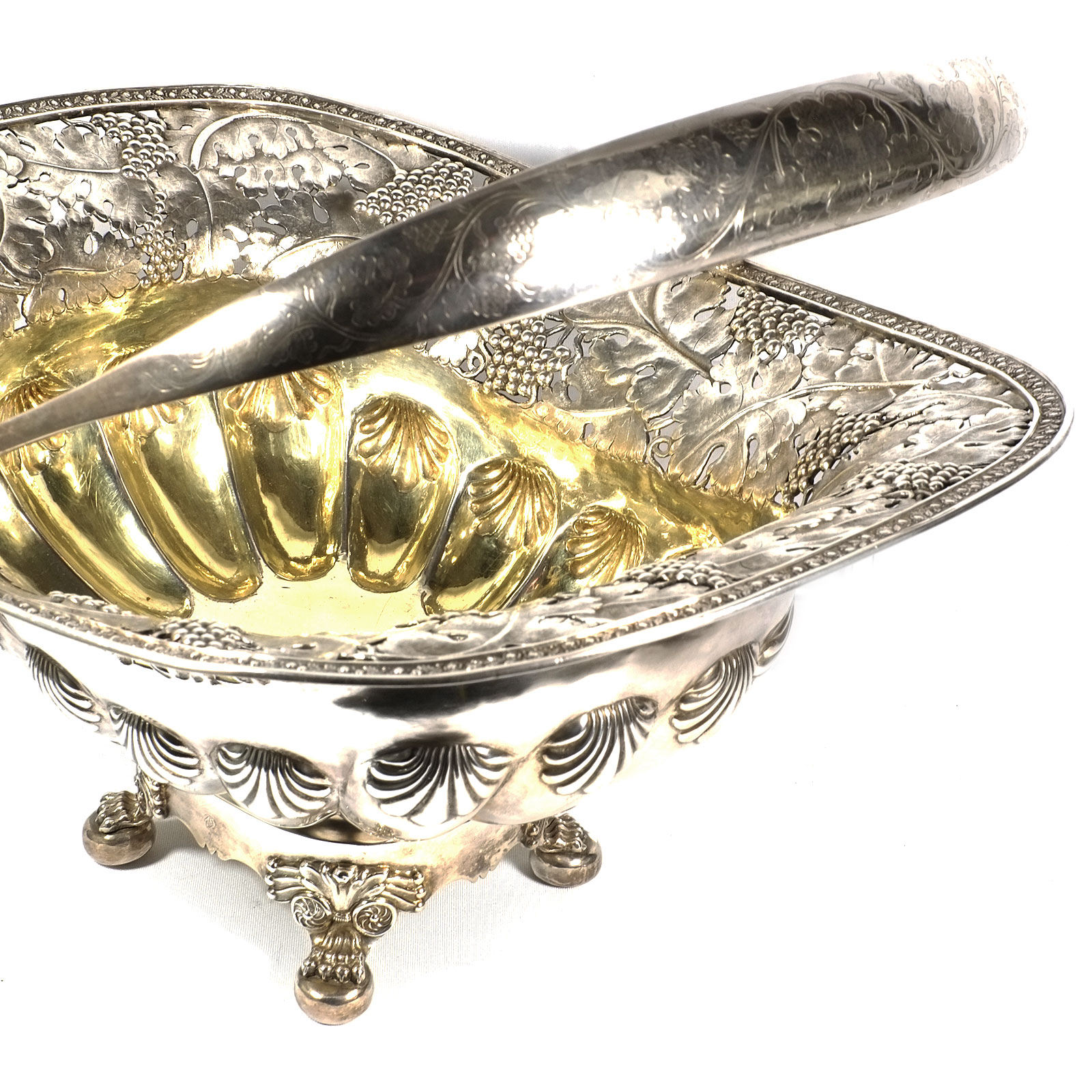 Rechteckiger Stand auf vier Tatzenfüßen, gebauchter, godronierter Korpus mit Muscheldekor, breiter ausgestellter Rand, durchbrochen gearbeitet mit Weinlaubfries. Übergreifender, floral gravierter Bandhenkel. Innen vergoldet.