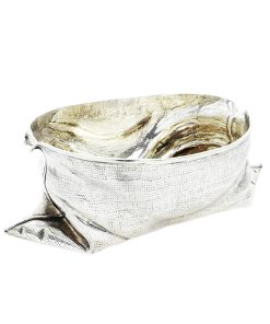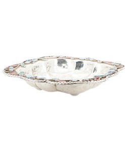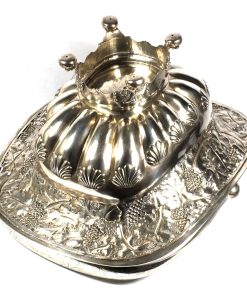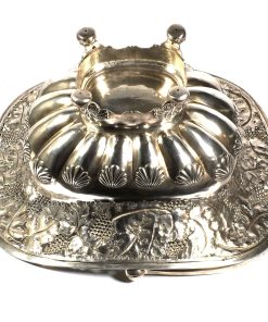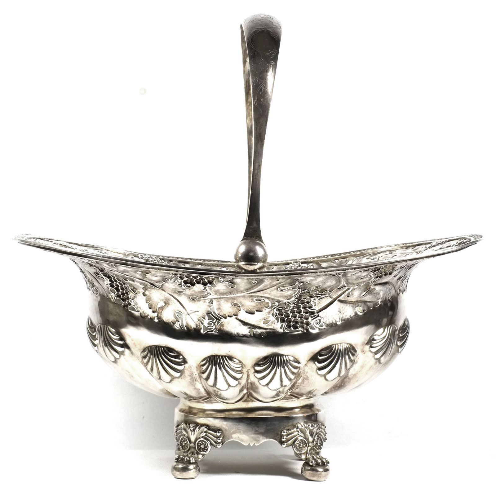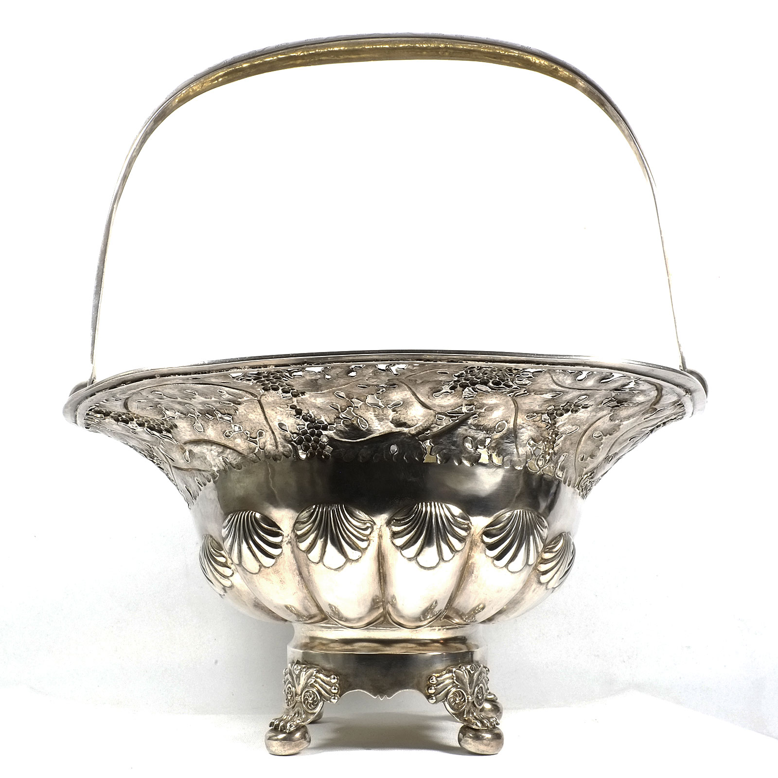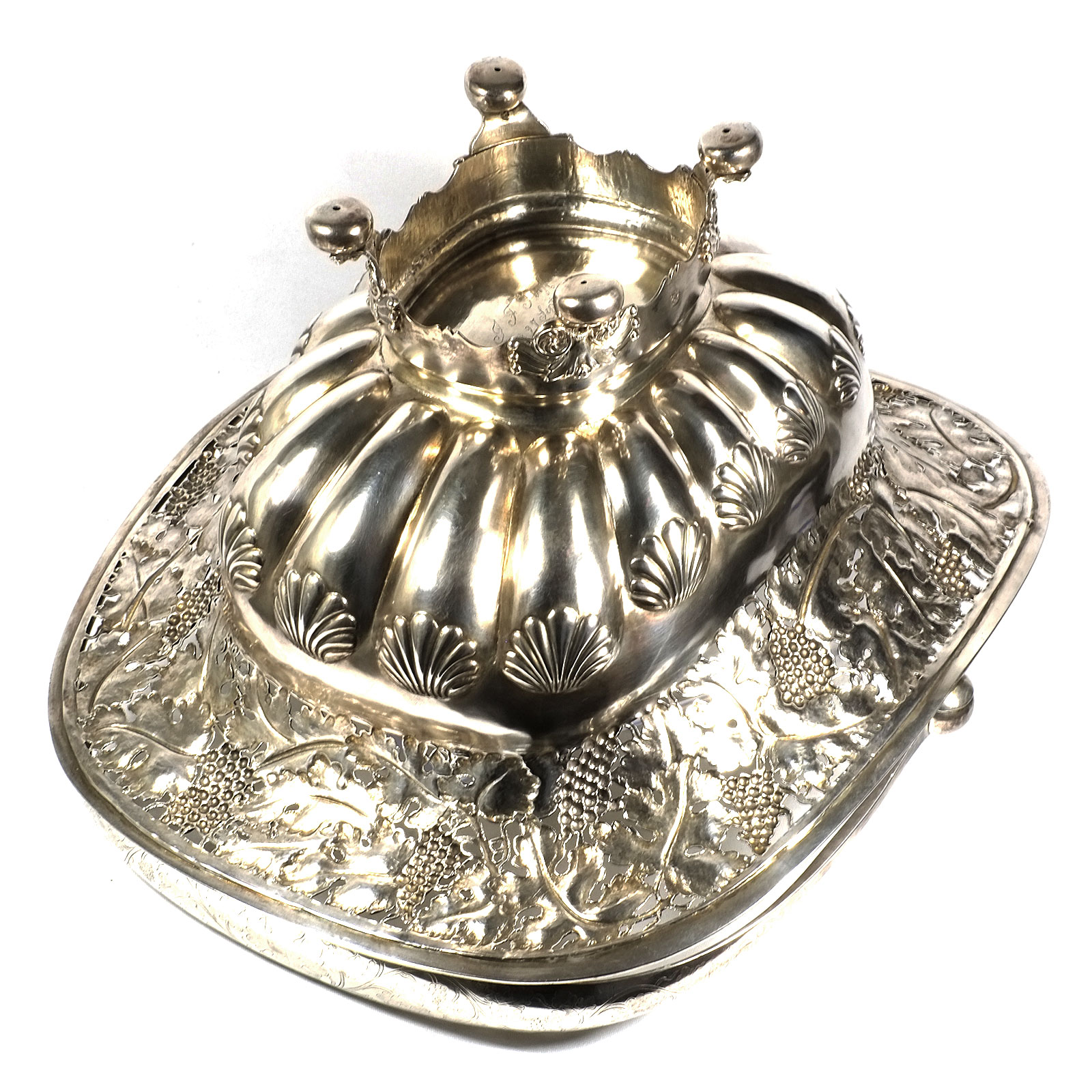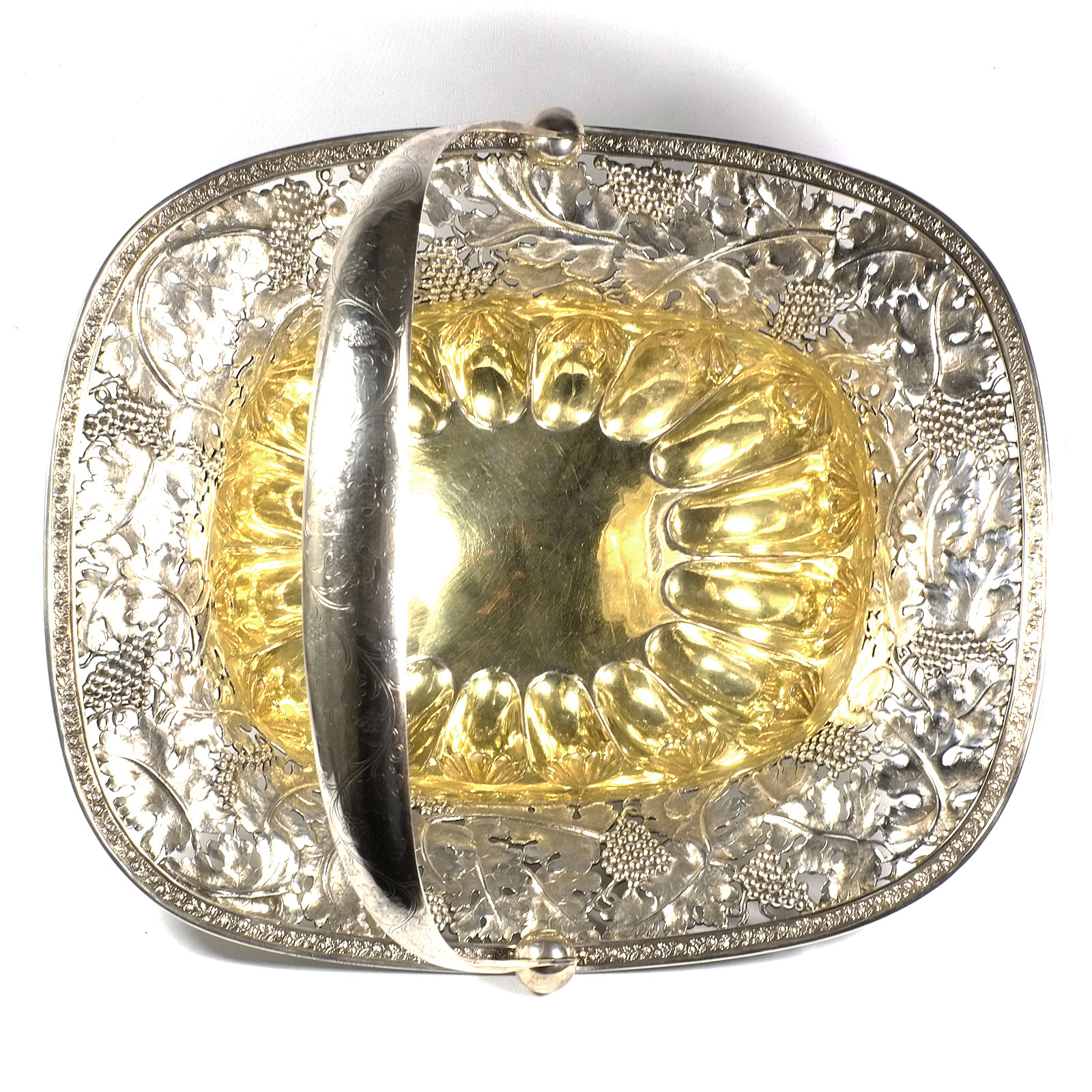 Rechteckiger Stand auf vier Tatzenfüßen, gebauchter, godronierter Korpus mit Muscheldekor, breiter ausgestellter Rand, durchbrochen gearbeitet mit Weinlaubfries. Übergreifender, floral gravierter Bandhenkel. Innen vergoldet.
