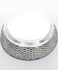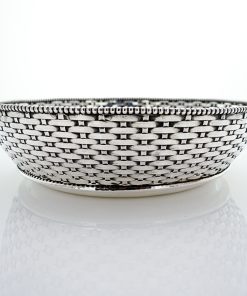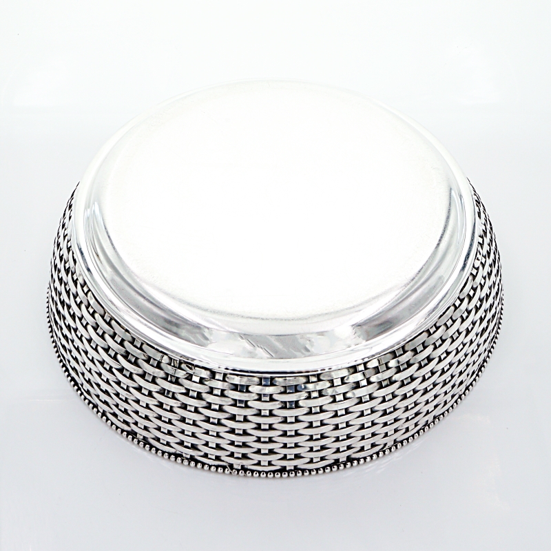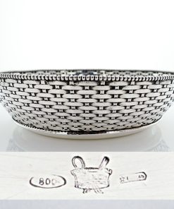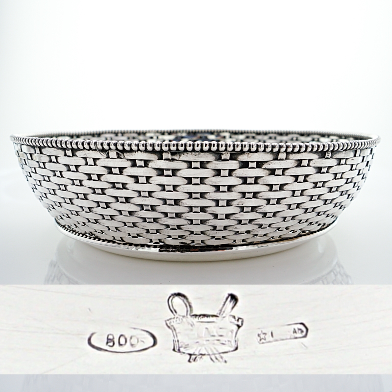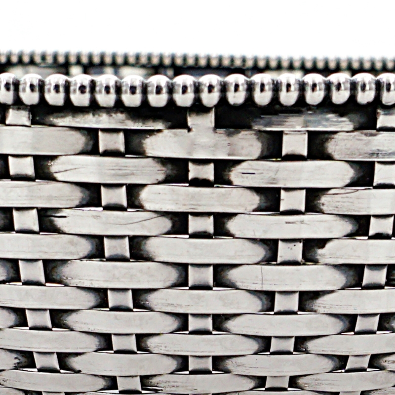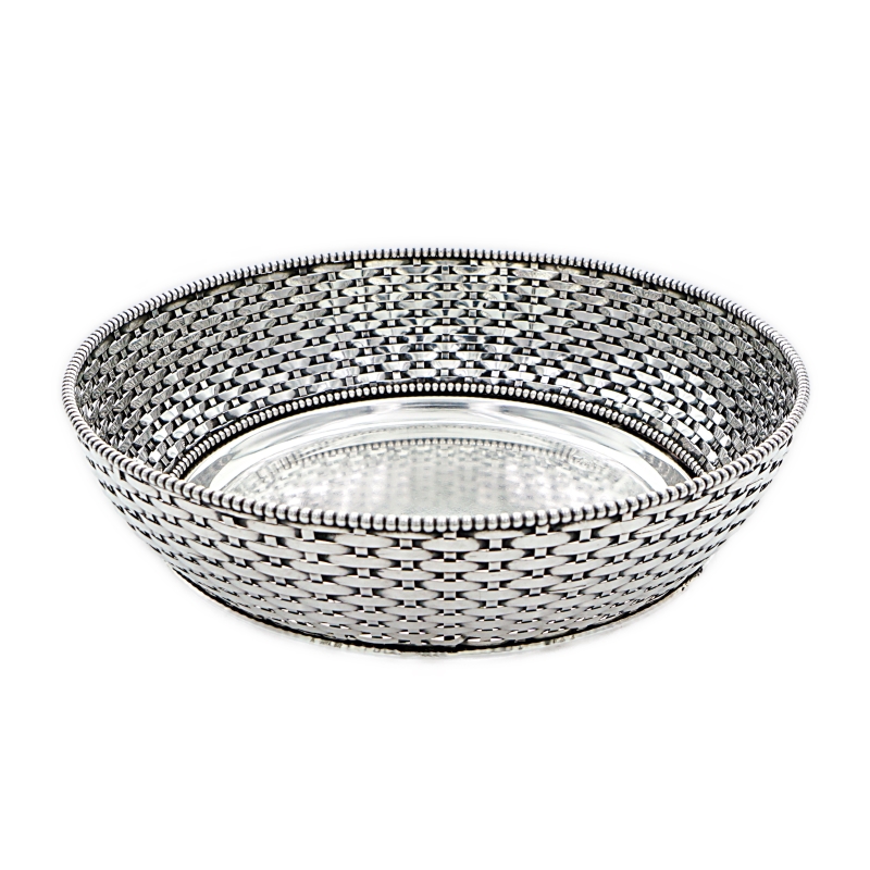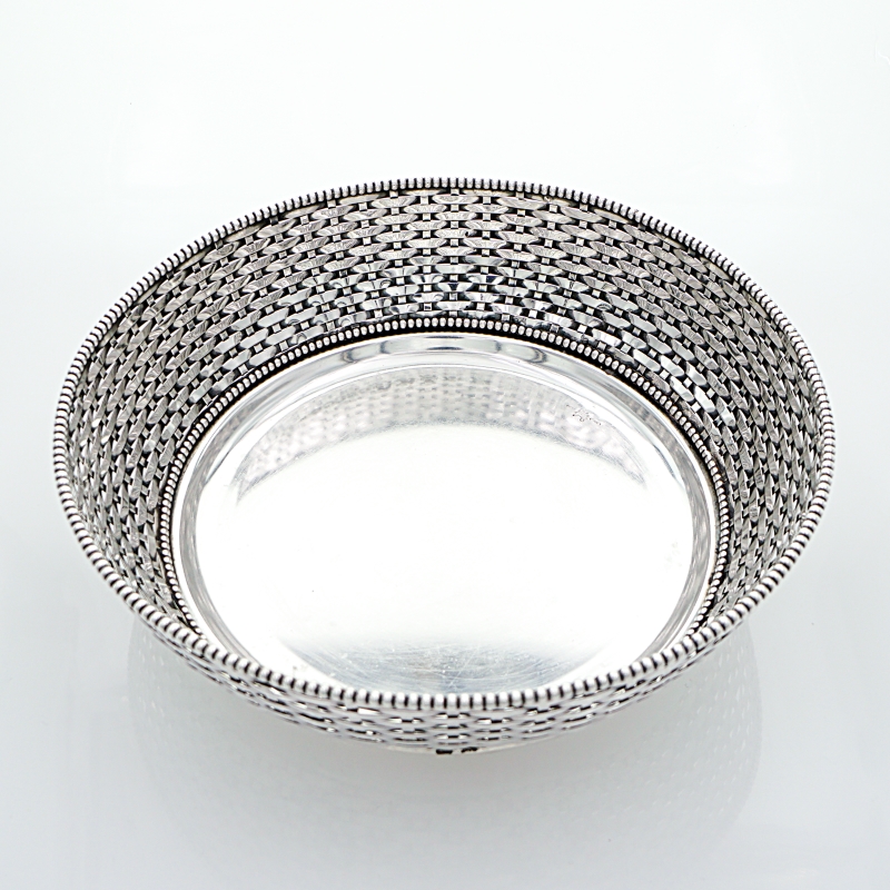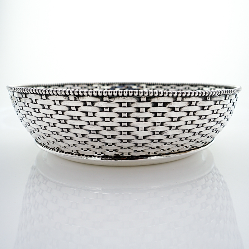 Gefällige handgearbeitete Brotschale aus massivem Silber. Der Brotkorb hat eine geflochtene Wandung aus Silberbändern, welche perfekt angefertigt ist. Den Inneren und oberen Schalenrand zieren Perlendekore. Die Silberarbeit ist innenseitig entsprechend mit Beschau, Meister -und Feingehaltsmarke versehen.