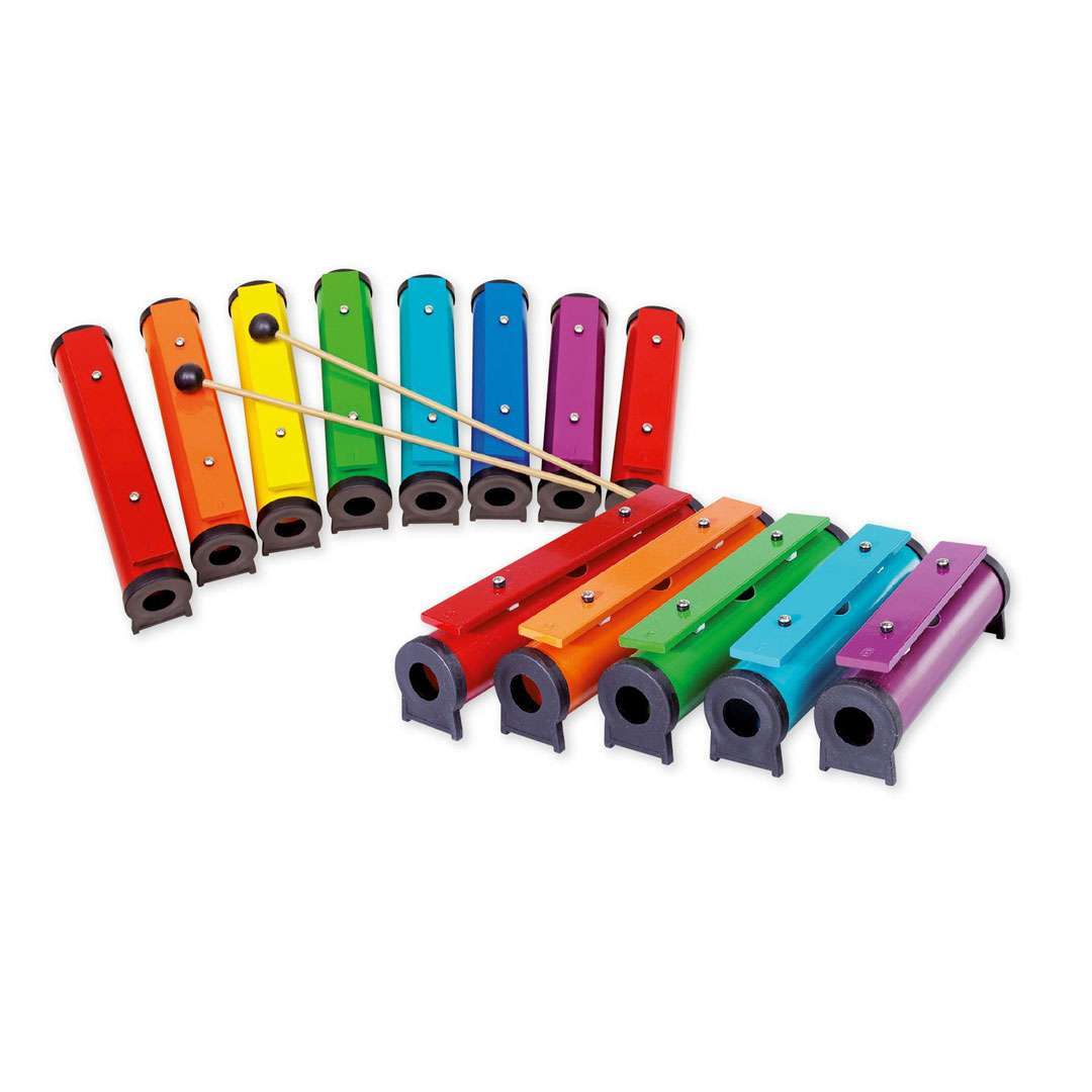 Material: Klangstäbe aus Metall, Resonanzkörper aus Kunststoff, Schlägel mit Gummikopf.