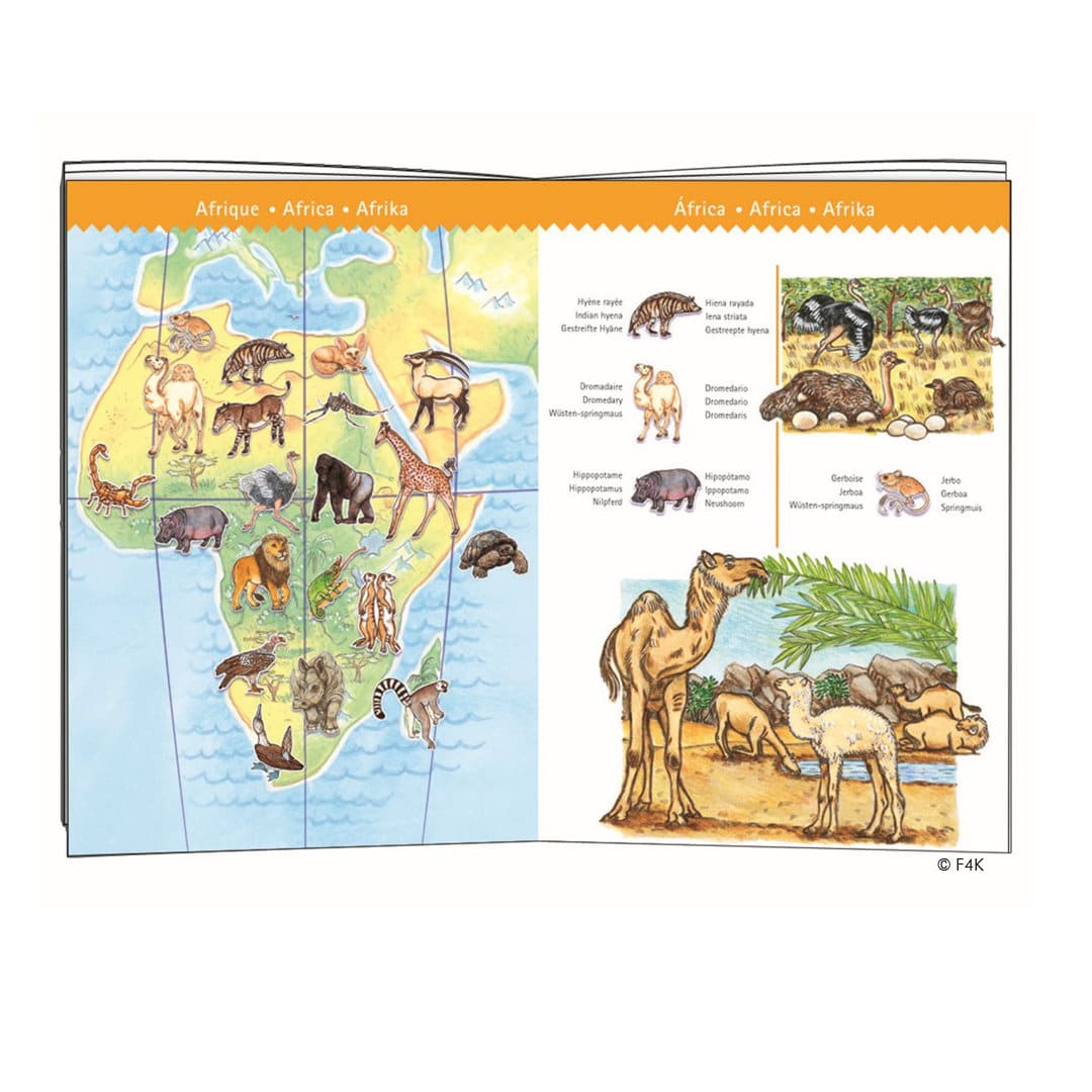 Ein großes Bild zum Puzzeln mit einer Weltkarte und Bilder der wichtigsten Tiere aus allen Regionen der Welt. Dazu ein großes Poster und ein Büchlein, in dem die Tiere und die Regionen, in denen sie leben, noch einmal abgebildet sind. Die Erläuterungen im Booklet gibt es in 5 Sprachen.
