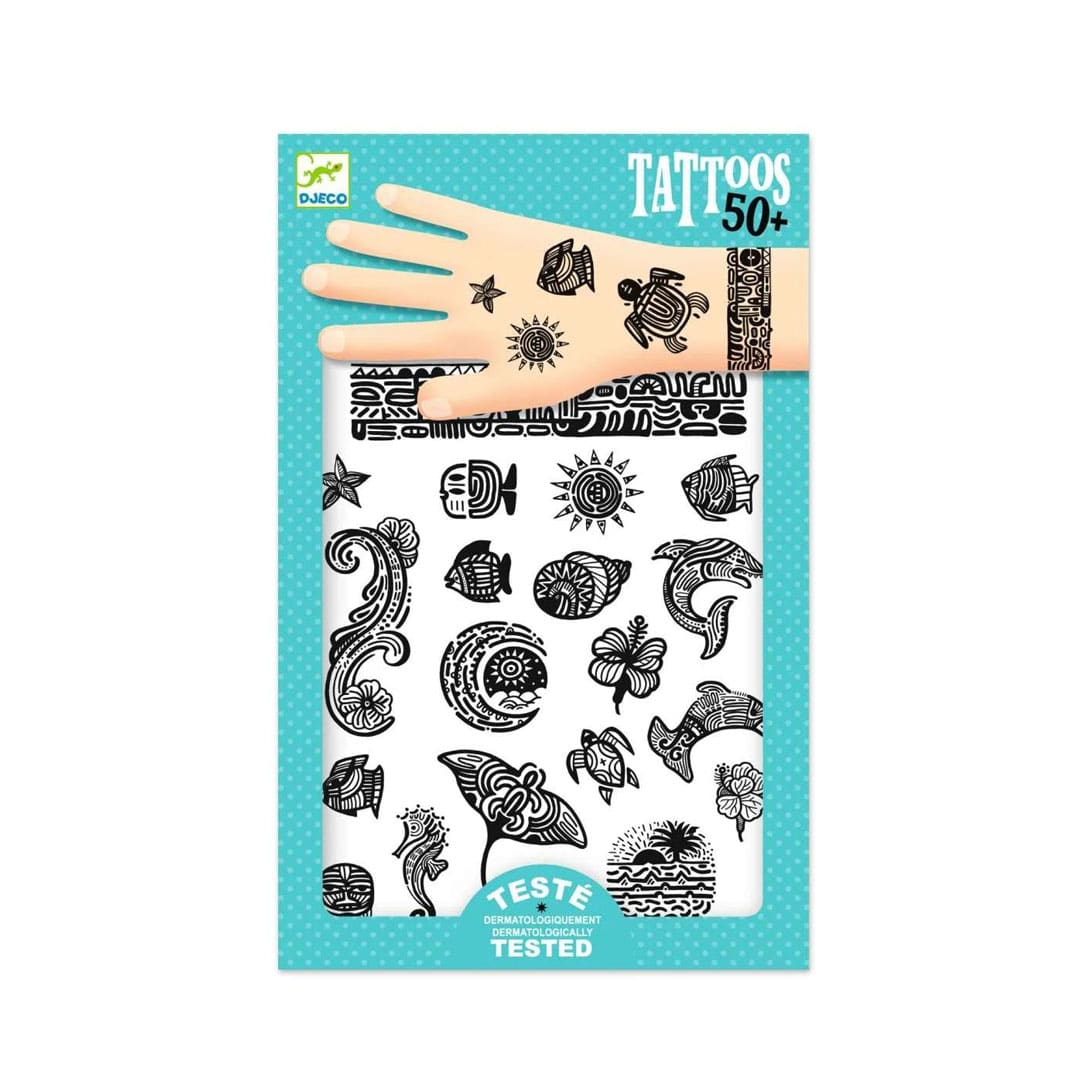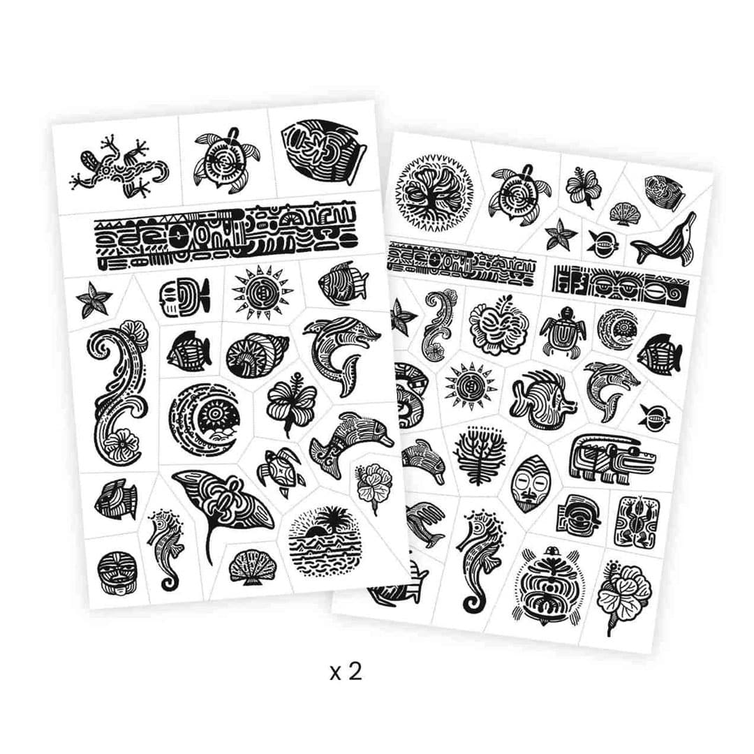 Mehr als 50 Tattoo-Motive auf 2 Blättern: Tattoos, die an Reisen und Strand erinnern und vom Design der berühmten polynesischen Tätowierungen inspiriert sind – für Kinder und Jugendliche zum Verkleiden und Verschönern!