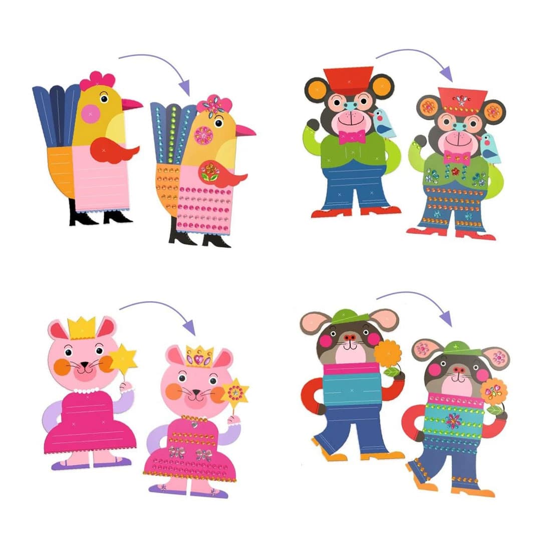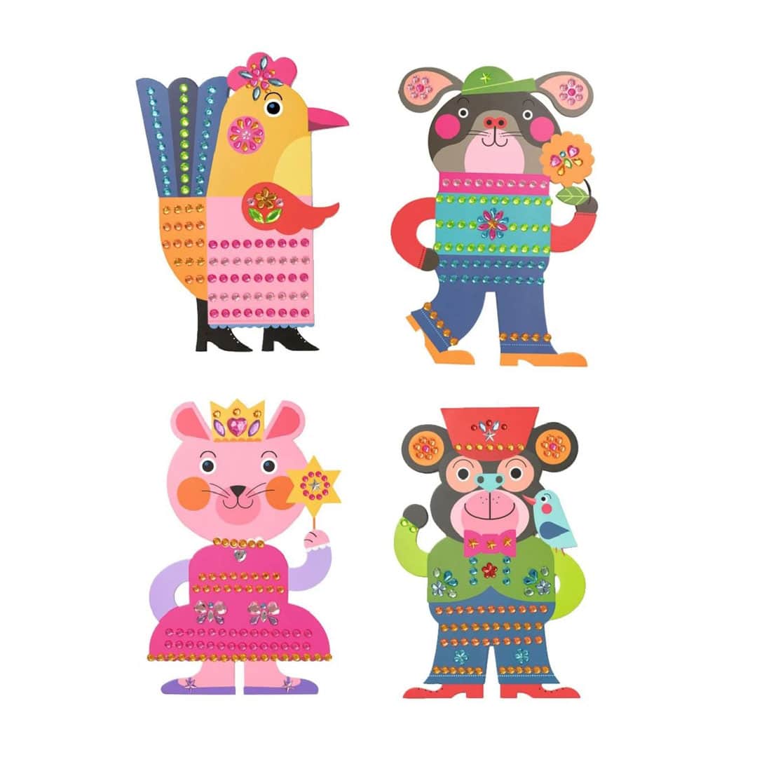 Gestalte Tierbilder mit glitzernden Strasssteinen! Die Steine sind miteinander verbunden und wenn du an einem ziehst, kommen alle Steine, die du für dieselbe Stelle brauchst, einfach ebenfalls mit! Du kannst die Steine dann auf die Karte mit dem Tier, das du ausgesucht hast, kleben. Wenn du fertig ist, leuchten die 4 Tiere und glitzern bunt!