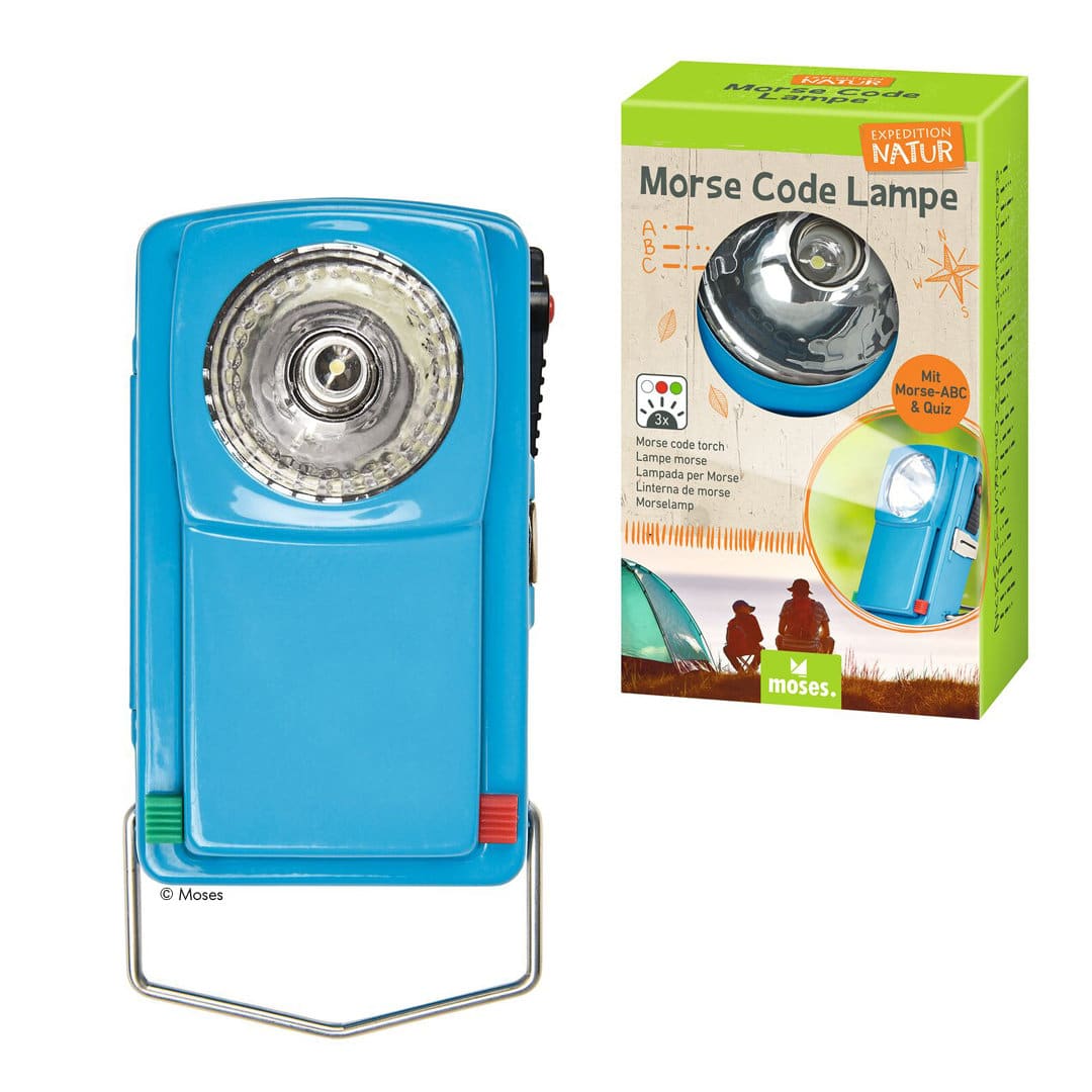 Die Morse-Code Lampe eignet sich für die Kommunikation im Morsecode. Sie enthält natürlich auch eine Anleitung zur Anwendung des Morsealphabets. So können mit ihr nachts und in der Dämmerung (oder im dunklen Zimmer) Botschaften über Leuchtsignale im Morsecode übermittelt werden. Sie enthält zwei Schieber mit Farbfiltern (grün und rot) für unterschiedliches Licht, einen seitlichen Knopf, um die Morsecodes zu senden sowie einen Metallbügel zum Aufstellen oder Aufhängen der Lampe.