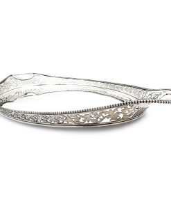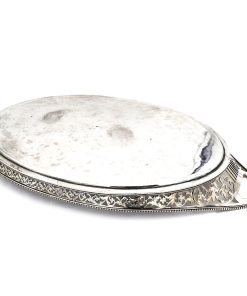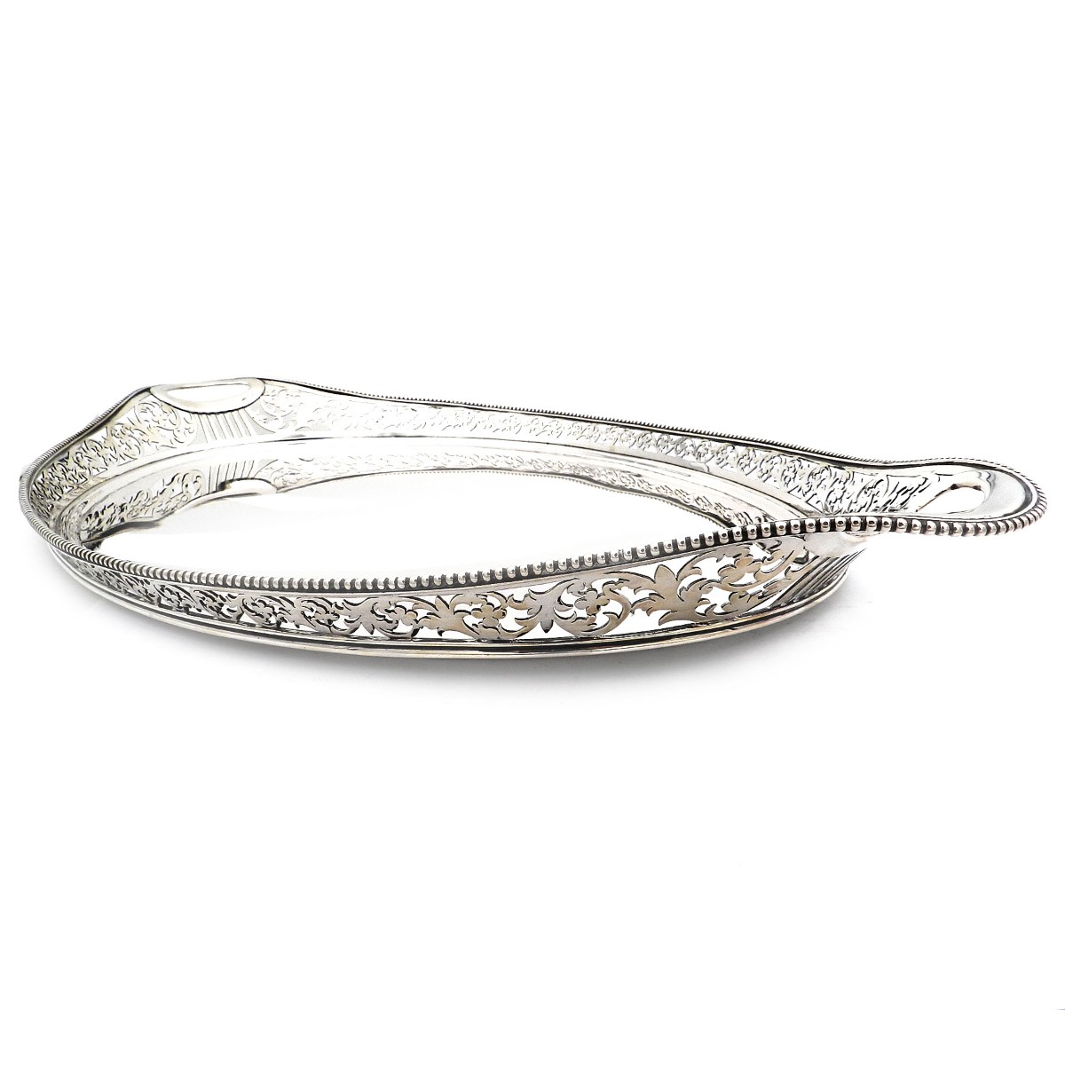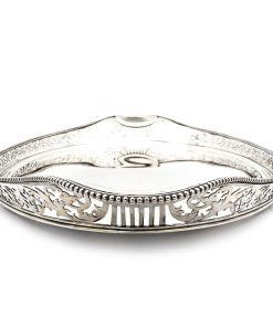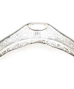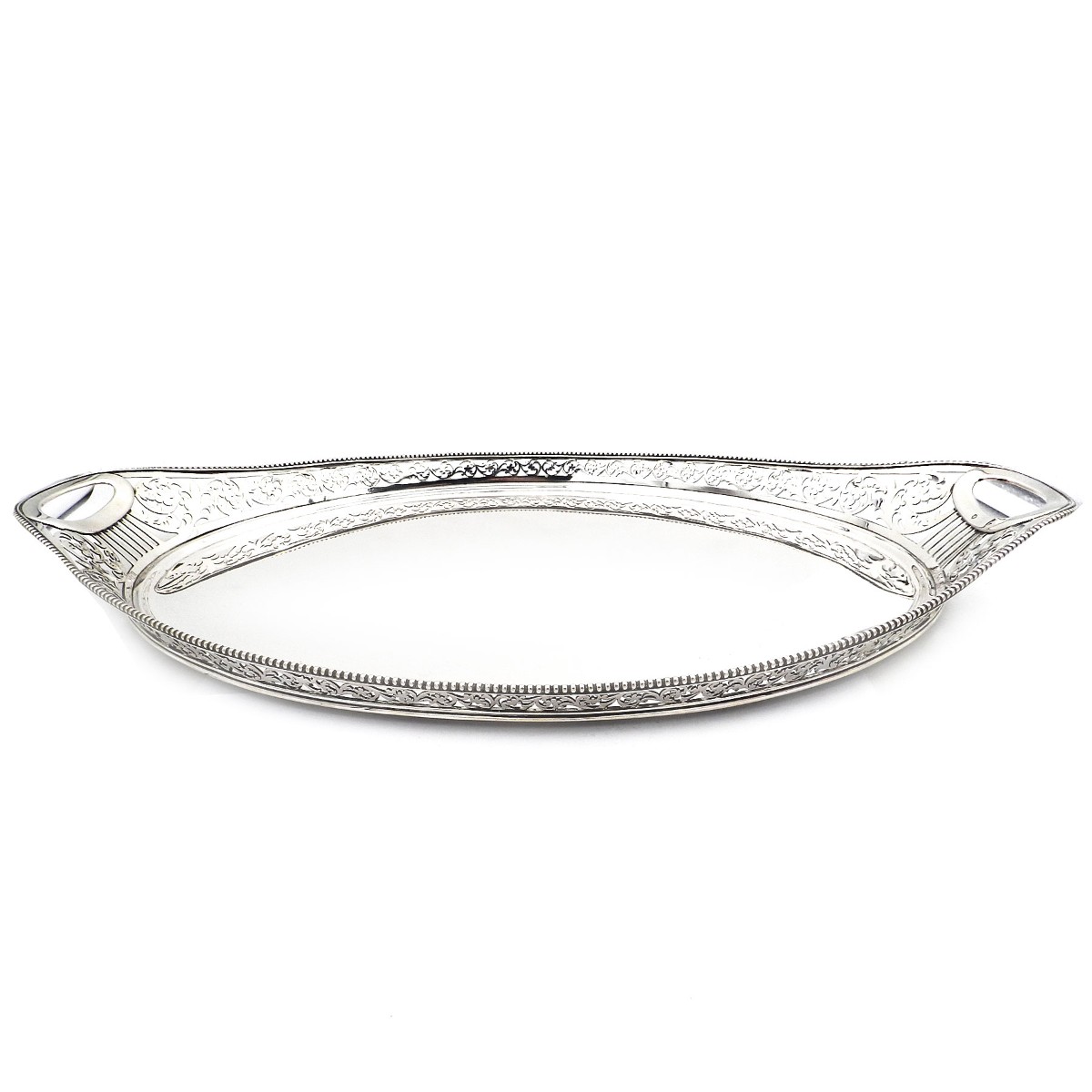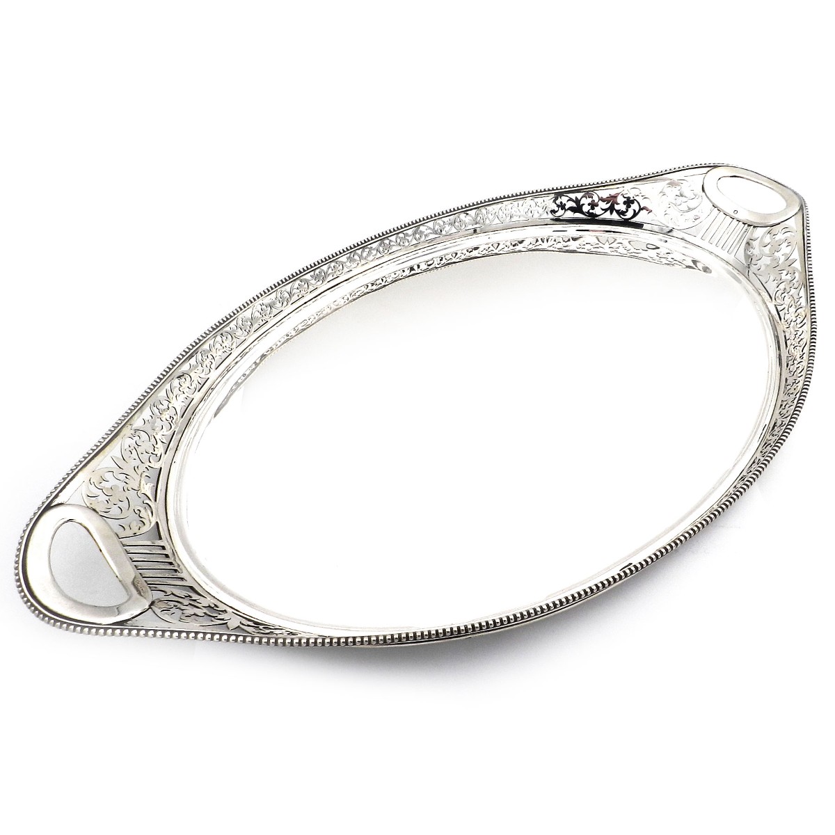 Wunderschönes großes Silbertablett in Schiffchenform gefertigt aus 925 Silber. Oval mit glattem Spiegel, reich verziert mit einem hohen durchbrochenen, von Hand gesägten Blumenrand und von einem Perlrand umzogen. An den Enden ansteigend und in seitlichen Grifföffnungen auslaufend. Gefertigt 1920 von Meister J. van der Dussen, Schoonhoven. Das elegante Silbertablett hat eine Größe von 31 x 54 cm. Es ist sehr massiv verarbeitet und wiegt 1755 Gramm.