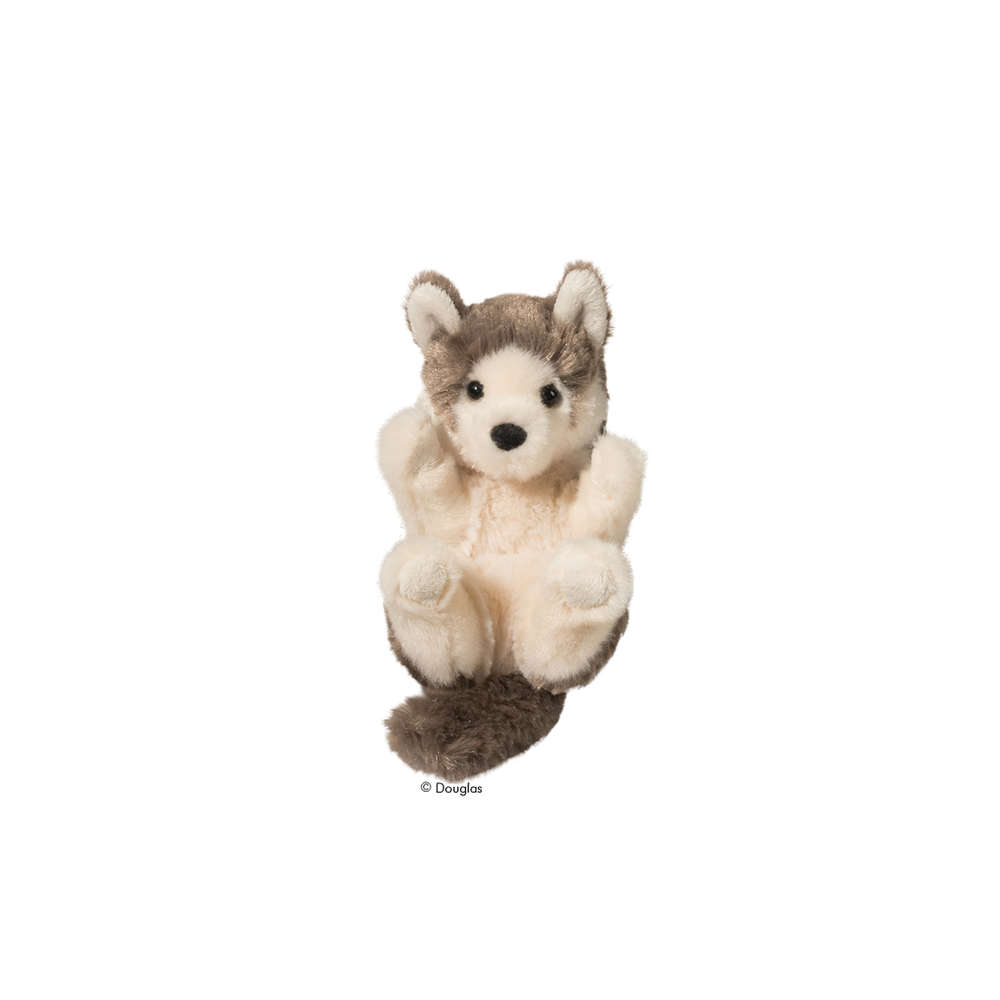 Kuscheltier kleiner Wolf auf dem Rücken liegend mit allen Vieren ausgestreckt, mit superweichem, flauschigem Fell und Glasaugen,