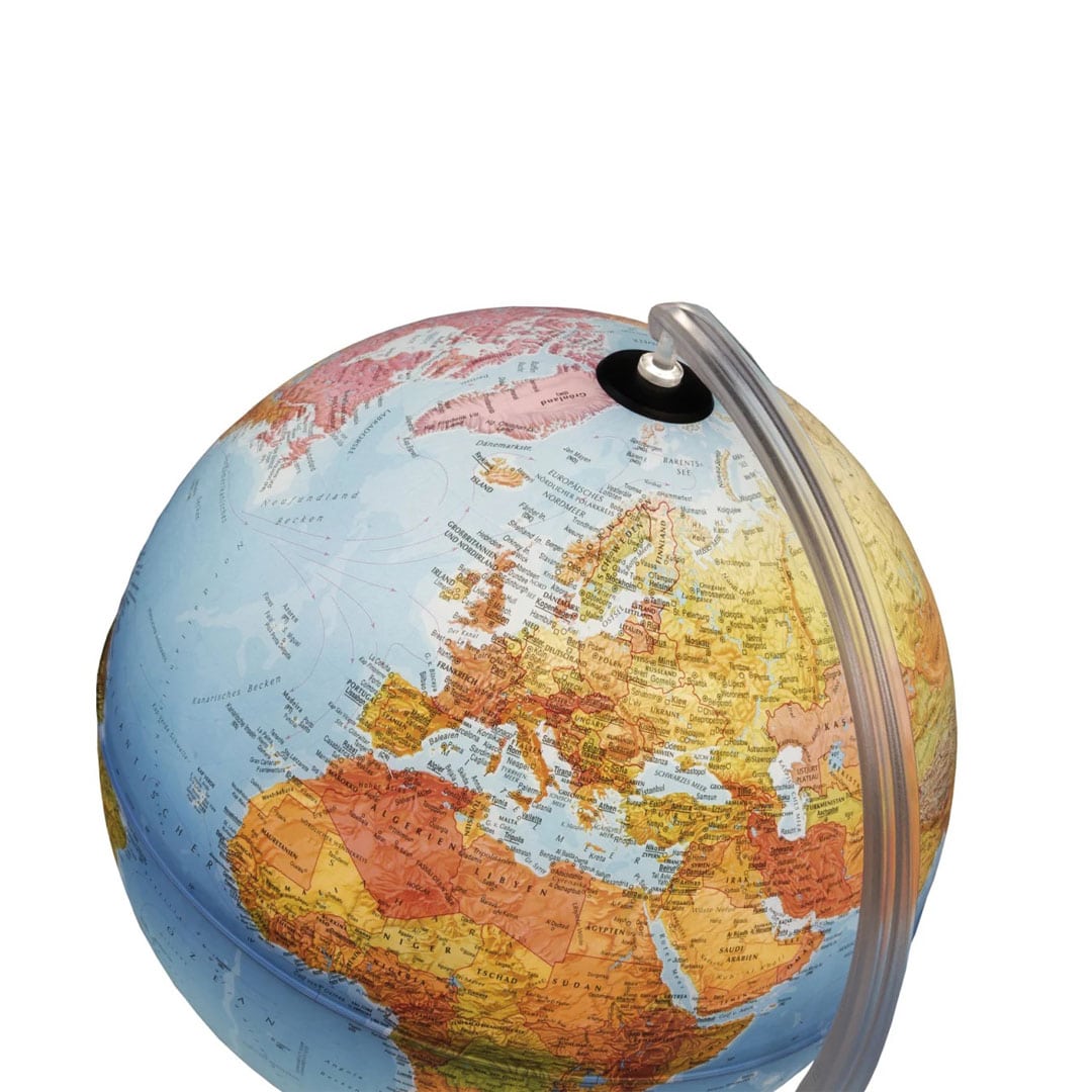 Schaltet man die Beleuchtung des Globus ein, wird die aktuelle politische Kartografie der Welt mit verschiedenen Farben für die einzelnen Staaten sichtbar.