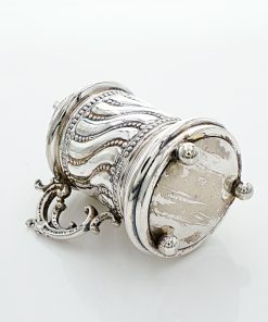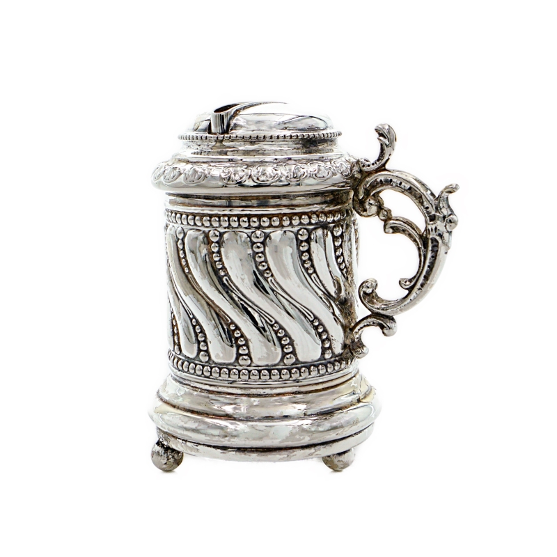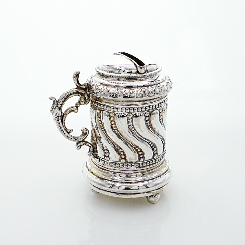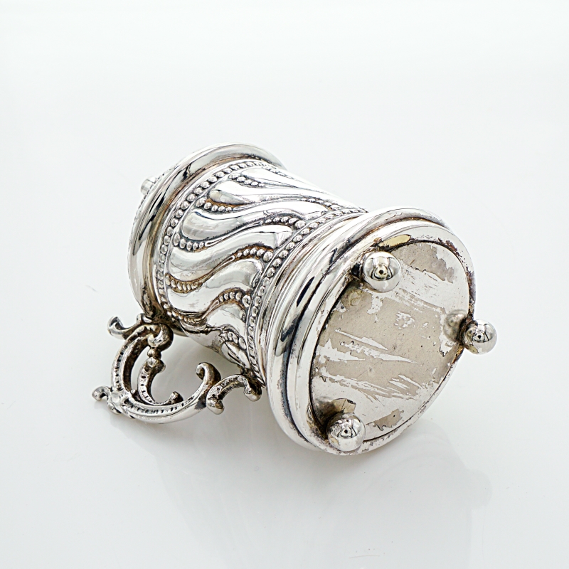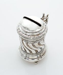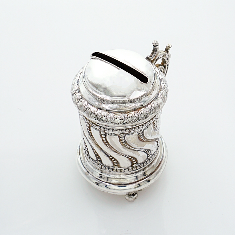 Münzdose oder Spardose in Form eines Humpens mit Rocaille-Handhabe auf drei Kugelfüßchen stehend. Der mittlere Korpus ist godroniert und mit Perlbänder Dekorierung gearbeitet. Auf der Oberseite befindet sich der breite Einwurfschlitz für Münzen der mit innenliegenden Rückhaltezähnchen gesichert ist. Die Unterseite war wohl mal so gearbeitet, dass man den Inhalt herausnehmen konnte – Dies ist nicht mehr möglich, da die Bodenplatte mit dem Korpus und den Kugelfüßen fest verbunden ist.