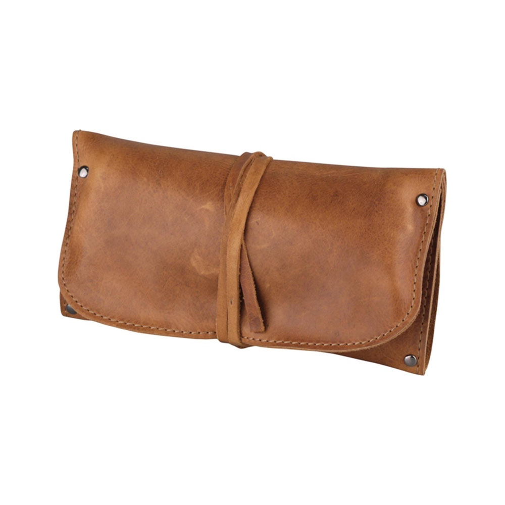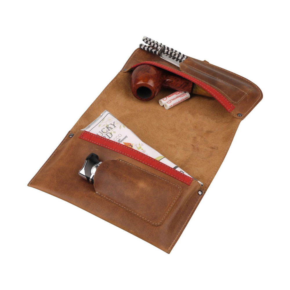 Pfeifentasche – mal anders Die praktische Rollenform muss ja nicht nur den Drehern” vorbehalten bleiben. Dieser aus hochwertigem und extrem robusten Leder gefertigte Pfeifen-Rollbeutel bietet Platz für Pfeife, Filter, Reiniger, Stopfer und Feuerzeug.