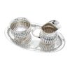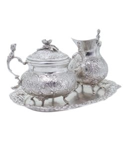 Dieses exquisite Rahmservice aus 800er Silber stammt aus der traditionsreichen Silberstadt Hanau und präsentiert sich im opulenten Stil des Neorokoko. Das Set besteht aus einem Sahnekännchen, einer Zuckerdose mit Deckel und einem passenden Tablett. Alle Teile sind reich verziert mit floralen Ornamenten, Rocaillen und barocken Voluten, die für das Neorokoko typisch sind. Die kunstvollen Henkel zeigen fein gearbeitete Puttenköpfe, die dem Ensemble eine besonders elegante Note verleihen.