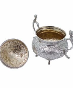 Das Service ruht auf geschwungenen, plastisch ausgearbeiteten Füßen und beeindruckt durch seine detailreiche Handarbeit und den hochwertigen Silberglanz. Der Deckel der Zuckerdose ist mit einer stilisierten Blume als Griff versehen – ein weiteres Beispiel für die hohe Handwerkskunst Hanauer Silberschmiede des späten 19. Jahrhunderts.