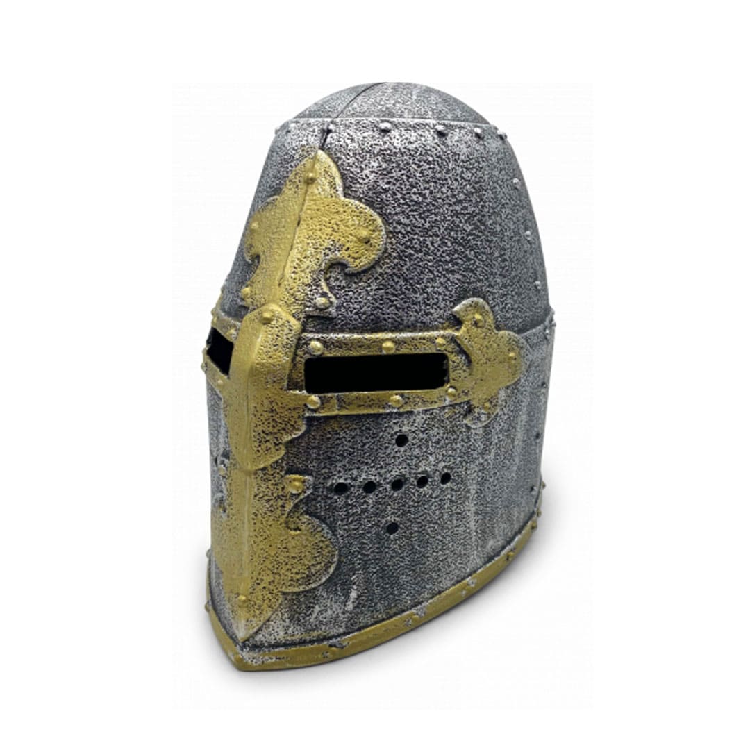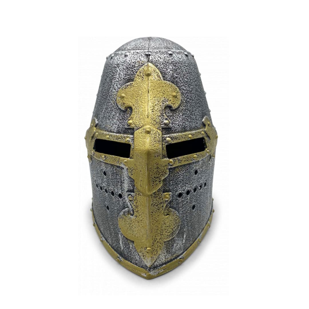 Ein echter Ritter benötigt einen Helm! Dieser Topfhelm „Bourbonische Lilie“ aus robustem Kunststoff ist ein idealer Ritterhelm für alle, die sich gern als Ritter verkleiden. Seine raue silberne Oberfläche besitzt goldene Verzierungen und seine Sehschlitze vermitteln ein authentisches Sichtfeld – wie im Mittelalter! Der Ritterhelm ist einfach ein Muss für jedes echte Ritterkostüm und ein Highlight auf der Faschingsparty!