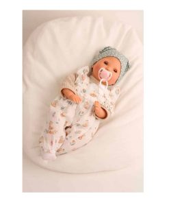 Spielpuppe Schnullerbaby Lenchen für Kleinkinder, mit einem niedlichen Sommerstrampler mit Fuchsmotiven und einem passenden Langarmshirt aus Strick sowie einer lustigen Baby-Mütze, inklusive Schnuller.