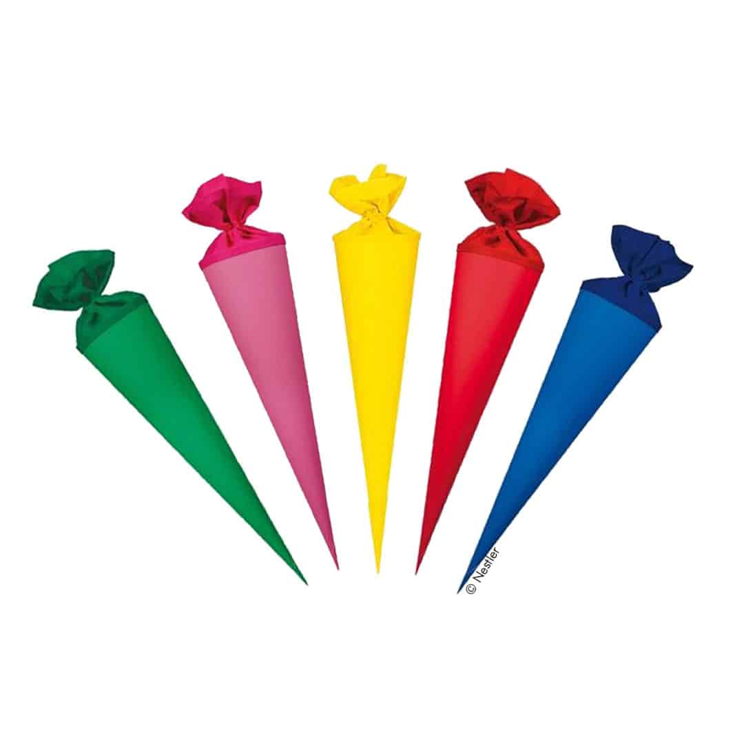 Wer seinem Kind eine individuelle Schultüte basteln möchte – bekleben, bemalen, bestecken, besprühen -, nimmt am besten eine einfarbige, um möglichst viel Spielraum beim Gestalten zu haben. Diese Bastelschultüten haben jeweils einen Filzverschluss, der farblich auf die Farbe der Zuckertüte abgestimmt ist.