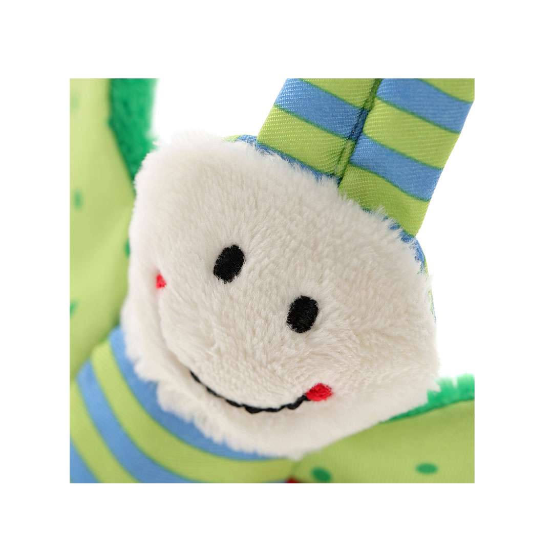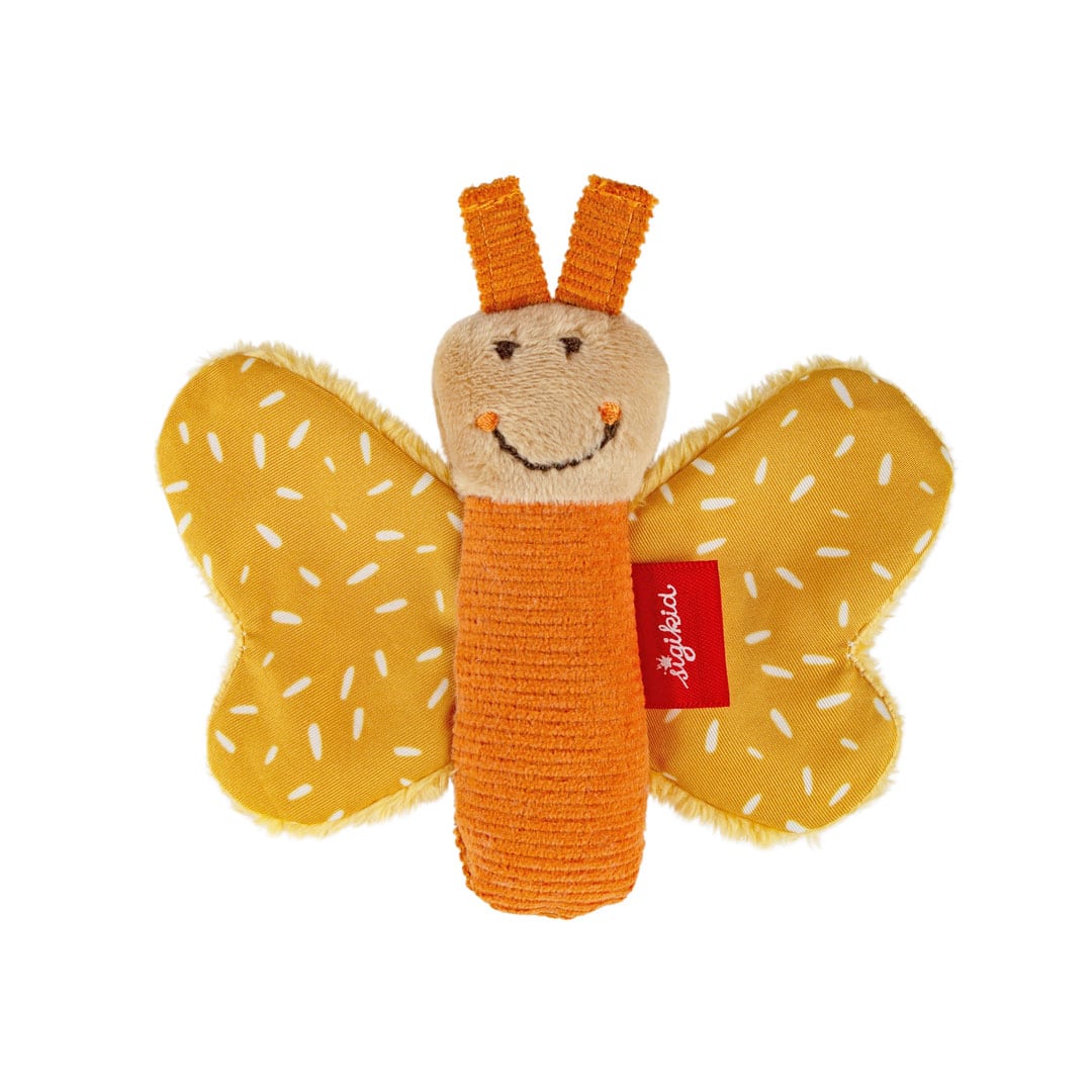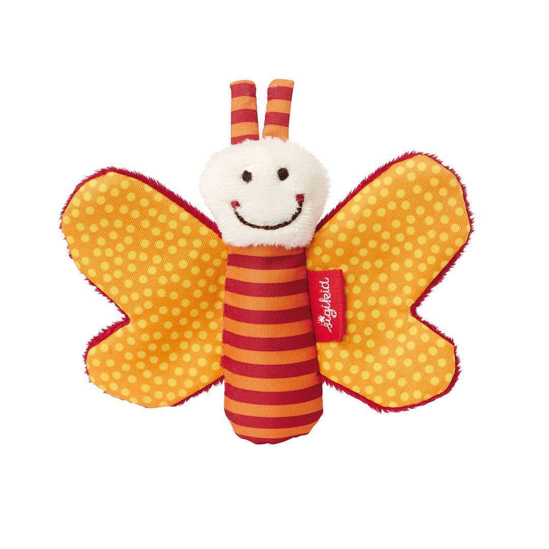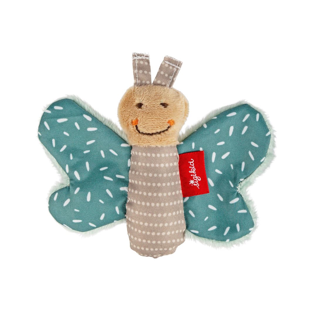 Ein kleiner Greifling für ganz kleine Babyhände ist dieser fröhliche Schmetterling aus weichem Material. Die eingebaute Knisterfolie erklingt, wenn das Baby die Flügel ergreift. Eignet sich sehr gut zum Mitnehmen im Kinderwagen und anderswo aufgrund seiner geringen Größe. Kann bedenkenlos in den Mund genommen werden.