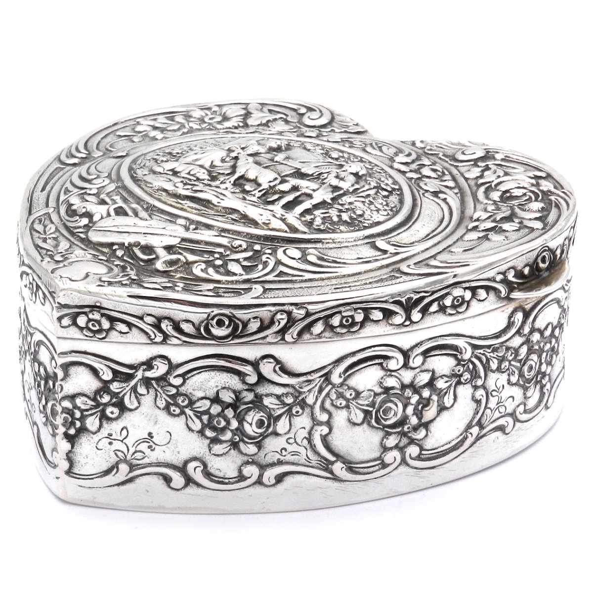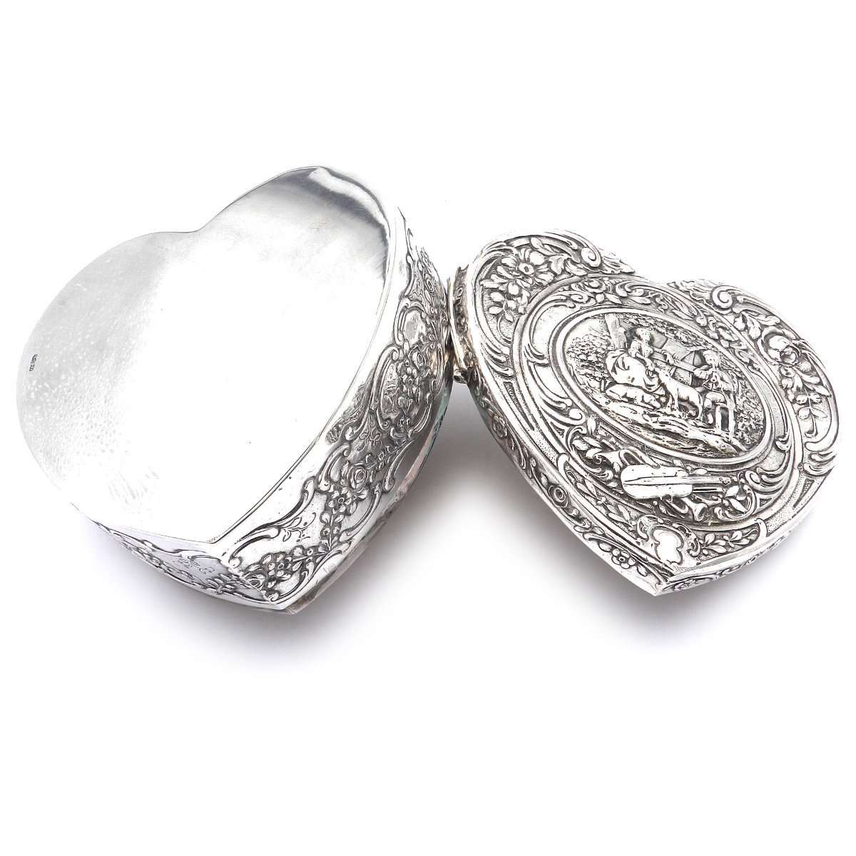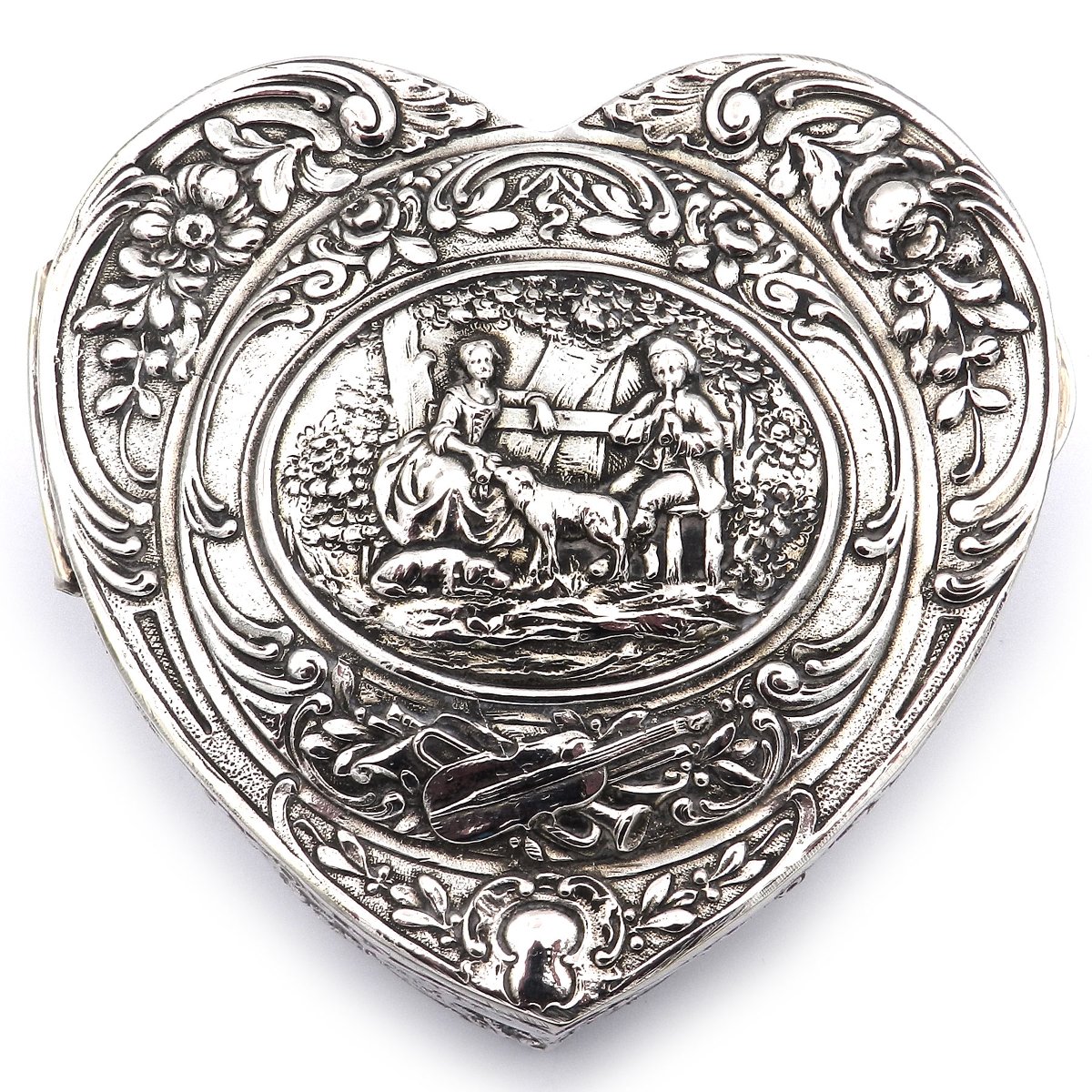 Dekorative Silberdose in Herzform im Rokoko Stil. Der herzförmige Korpus mit gerader Wandung auf glattem Stand, allseitig Reliefdekor aus Blüten- und Blattranken, seitlich scharnierter Deckel. Auf dem reich dekoriertem Deckel eine ovalen Kartusche mit romantischer Szene, die ein musizierendes Paar mit Hunden in einer Laube zeigt. Die hübsche Silberdose ist im Inneren vergoldet. Sie hat eine Größe von 11,5 x 11,5 cm und eignet sich zum Aufbewahren von Konfekt oder diversen Kleinodien.