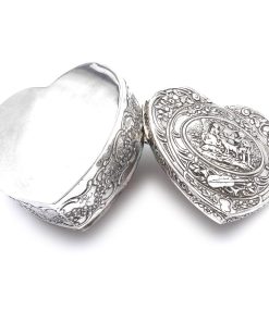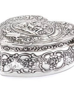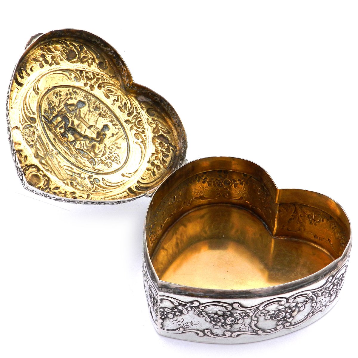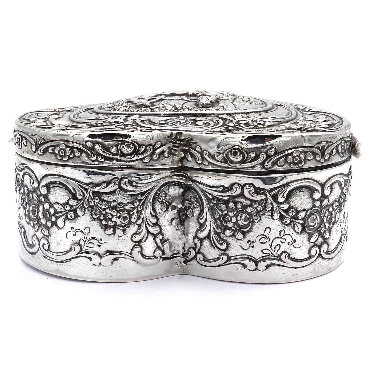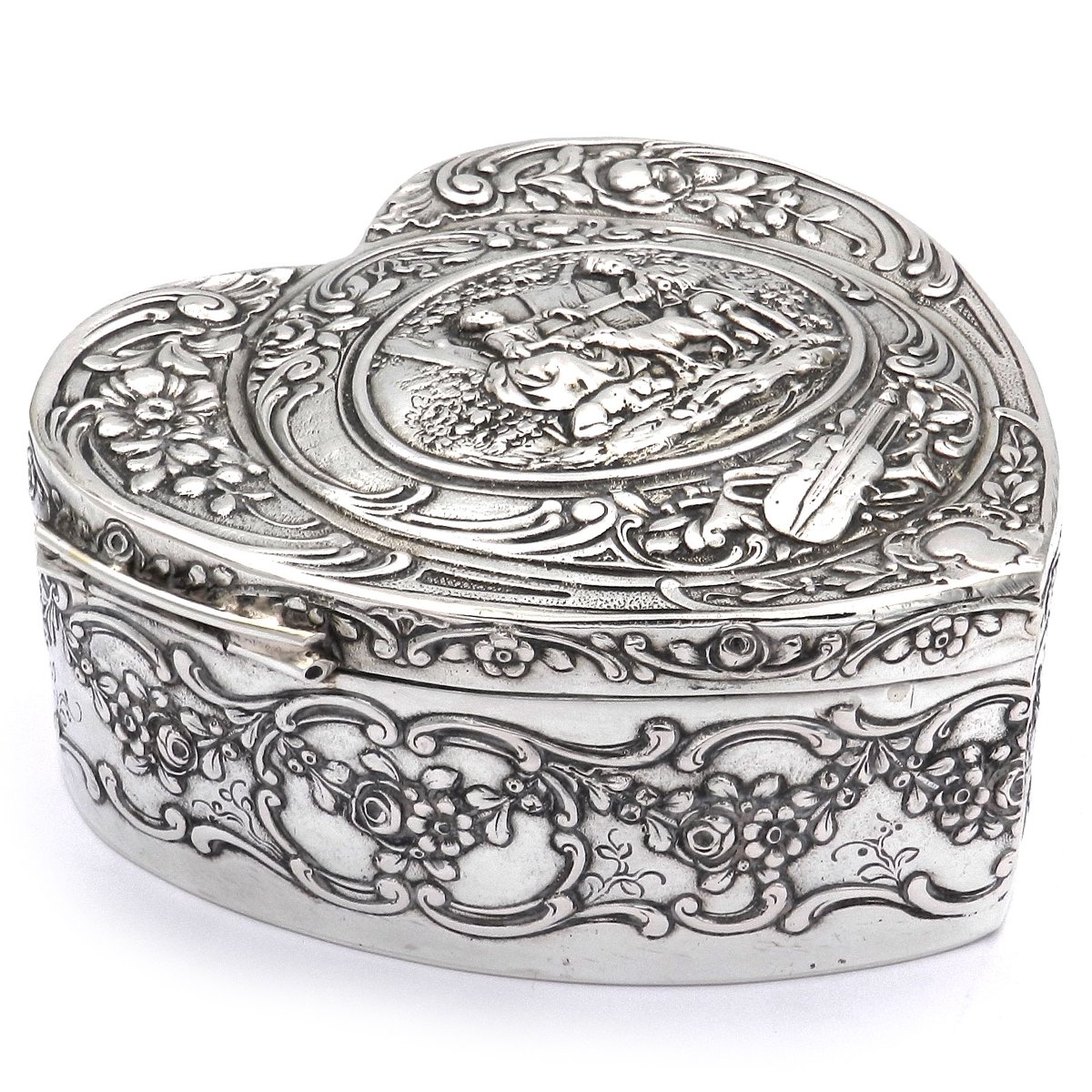 Dekorative Silberdose in Herzform im Rokoko Stil. Der herzförmige Korpus mit gerader Wandung auf glattem Stand, allseitig Reliefdekor aus Blüten- und Blattranken, seitlich scharnierter Deckel. Auf dem reich dekoriertem Deckel eine ovalen Kartusche mit romantischer Szene, die ein musizierendes Paar mit Hunden in einer Laube zeigt. Die hübsche Silberdose ist im Inneren vergoldet. Sie hat eine Größe von 11,5 x 11,5 cm und eignet sich zum Aufbewahren von Konfekt oder diversen Kleinodien.