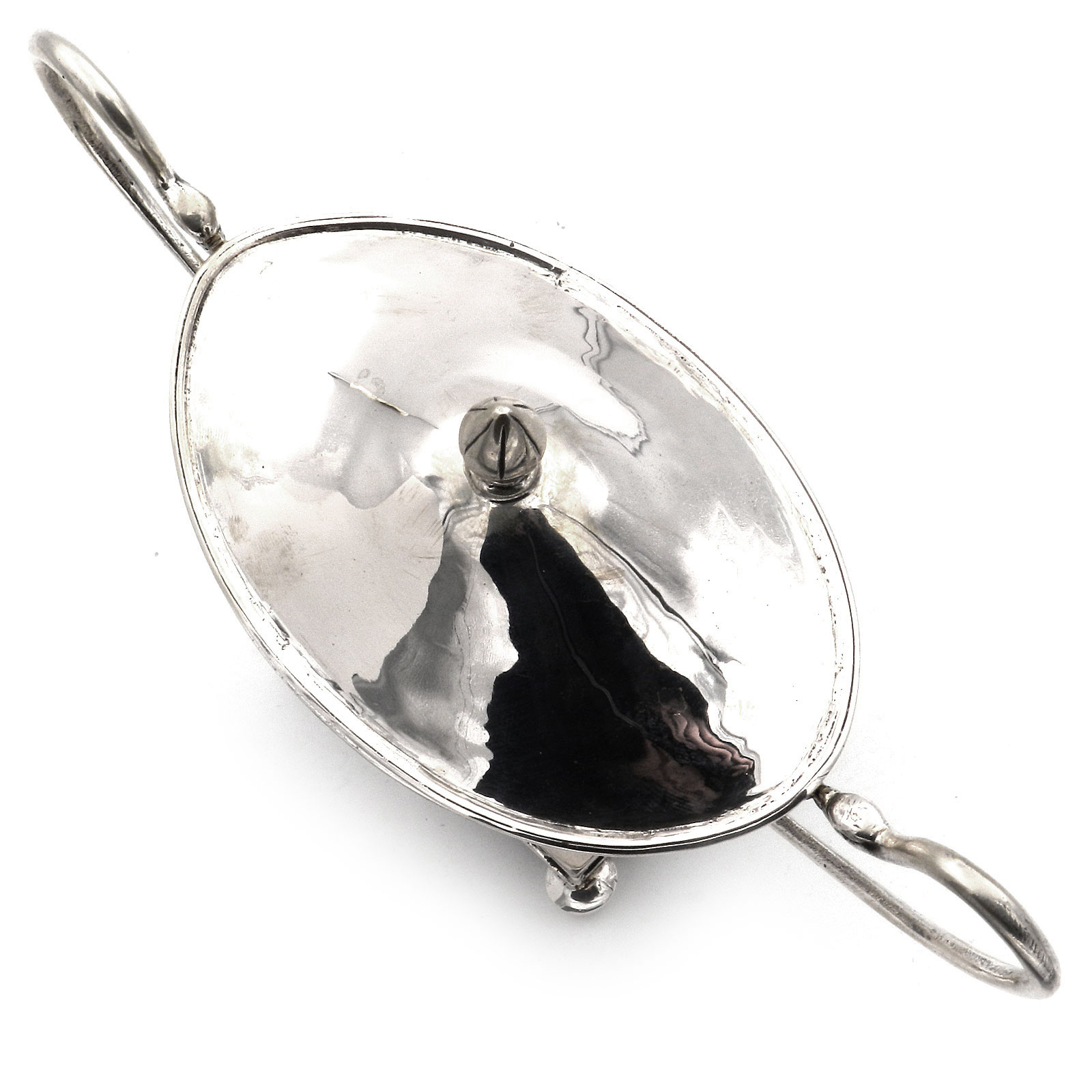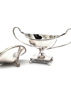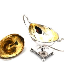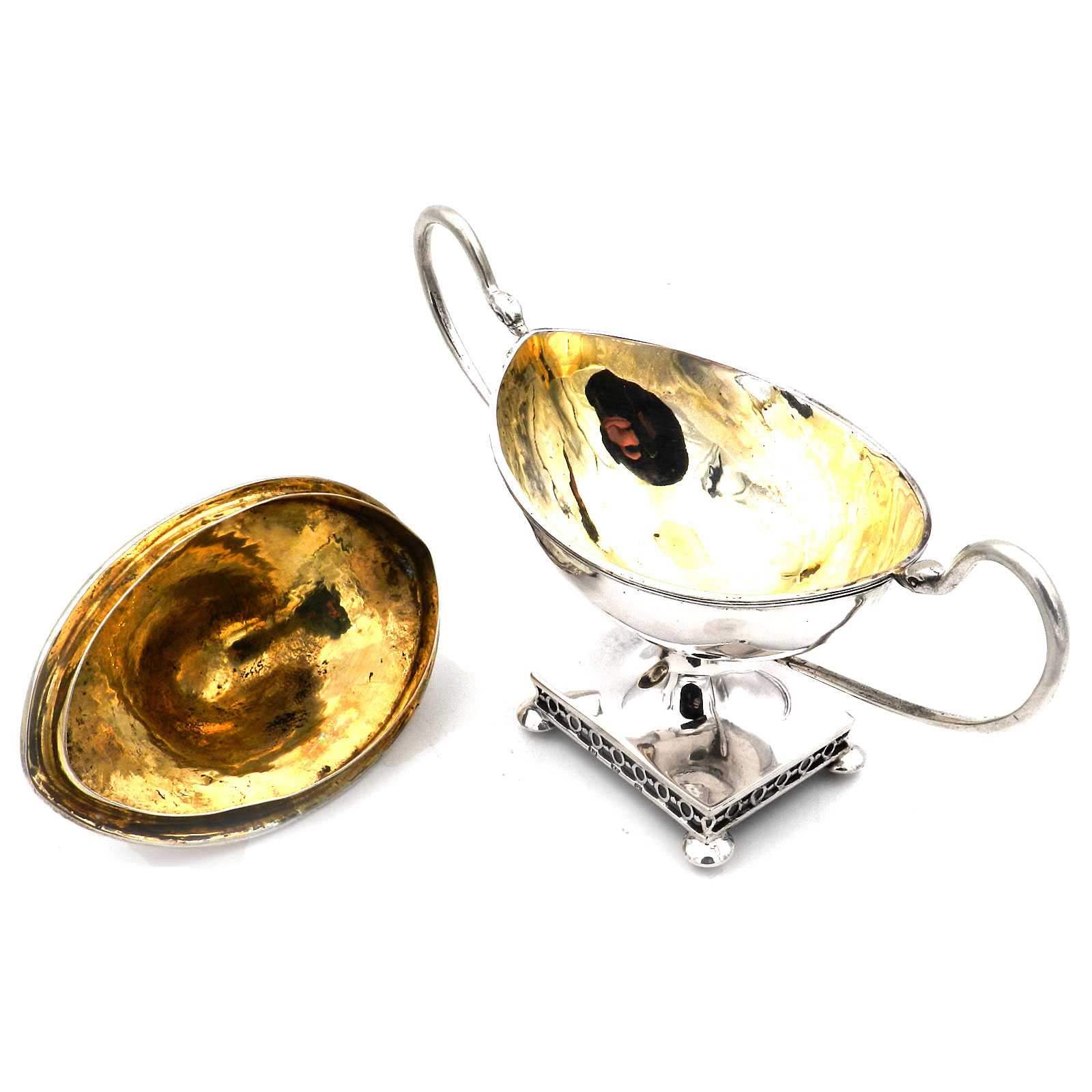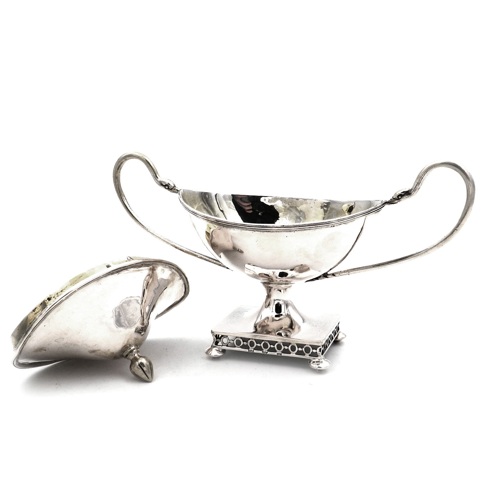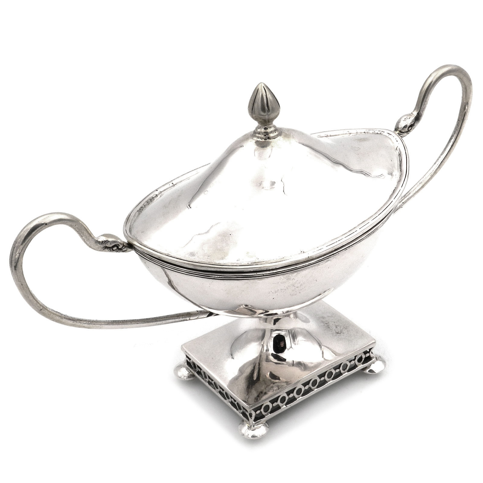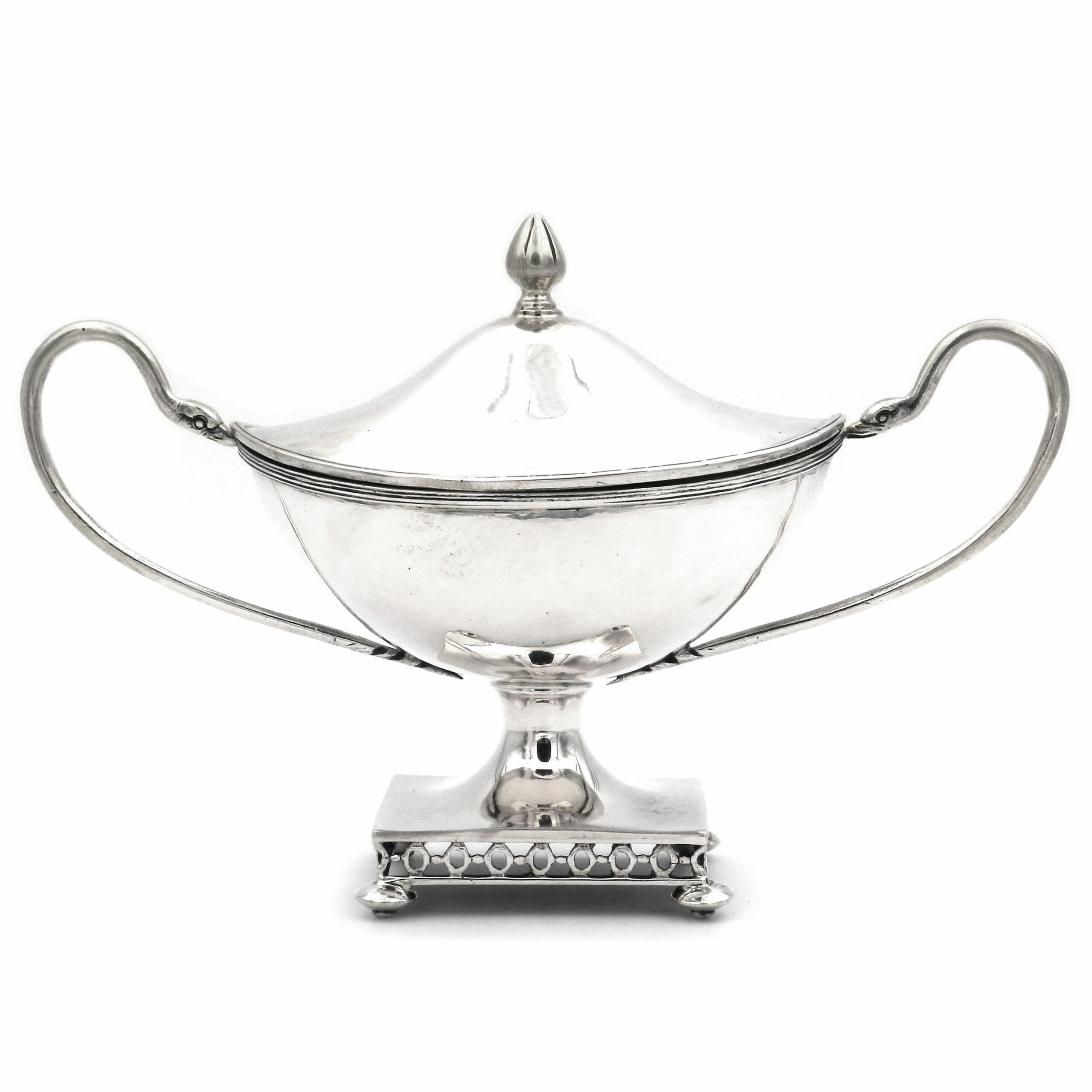 Dekorative Zuckerdose als Deckeldose in Schiffchenform, eingezogener Fuß ausf rechteckigem, gitterartig durchbrochenem Stand unf Kugelfüßchen, ovaler Korpus „en bateau“, seitlich langgestreckte J-Henkel mit Schwanenköpfen, Stülpdeckel mit Knospenknauf. Innen vergoldet.