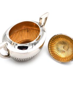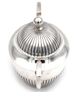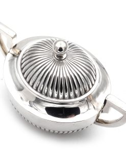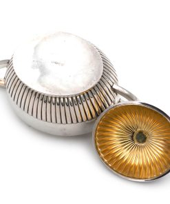 Elegante ovale Deckeldose auf glattem Stand, auf der Wandung umlaufender Godronendekor, seitliche J-Henkel, Stülpdeckel mit Vasenknauf. Innen vergoldet.