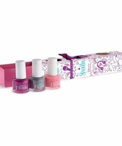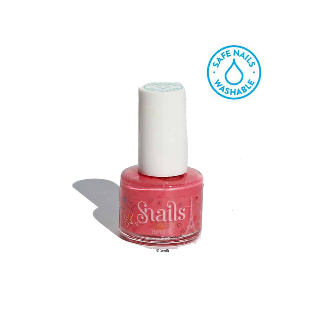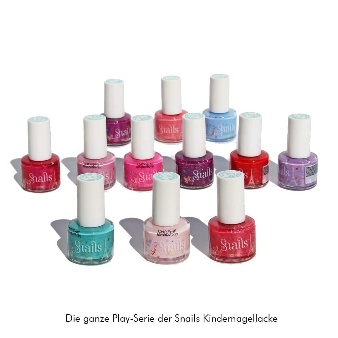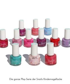 Die Marke Snails (steht für „Safe Nails“) hat einen Kindernagellack entwickelt, der nur aus Wasser, ungiftigen Farbstoffen und Acrylpolymeren (Kunststoffen) besteht. Zum Entfernen dieses Nagellacks benötigt man keinen acetolhaltigen, hochgiftigen Nagellackentferner! Der Nagellack lässt sich einfach mit Wasser, Seife und einem leichten Druck ohne Rückstände wieder abwaschen. Auch aus der Kleidung und anderen Textilien kann man den Nagellack einfach auswaschen. Ein umweltfreundlicher und zu 100% kindersicherer Nagellack.