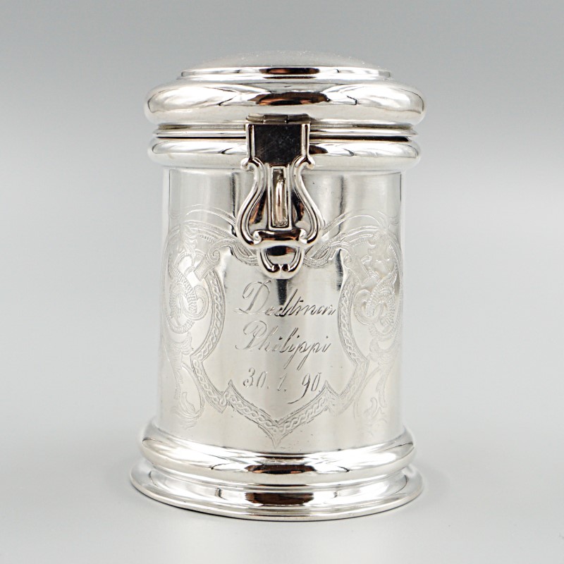 Diese Münzdosen waren nicht nur schützende Hüllen für wertvolle Währungen, sondern auch kunstvolle Meisterwerke. Fein gearbeitete Verzierungen, Gravuren und oft filigrane Details zeugen von der Bedeutung, die diesen Objekten beigemessen wurde. Das verwendete echte Silber unterstreicht nicht nur den materiellen Wert, sondern auch den kulturellen Reichtum, der mit diesen Münzdosen verbunden ist.