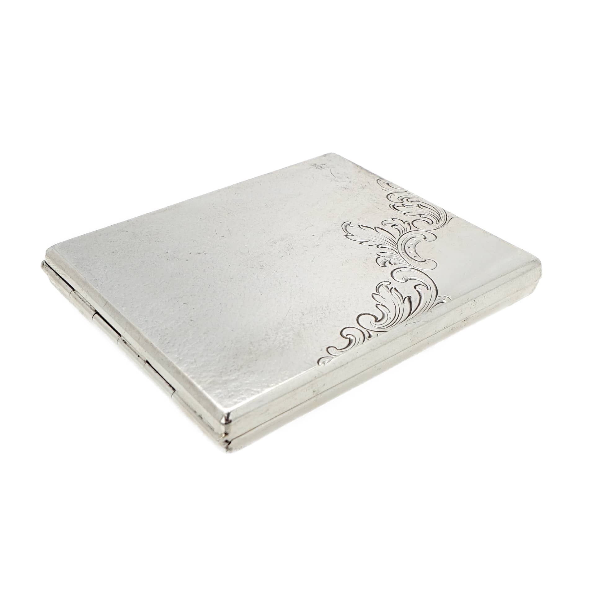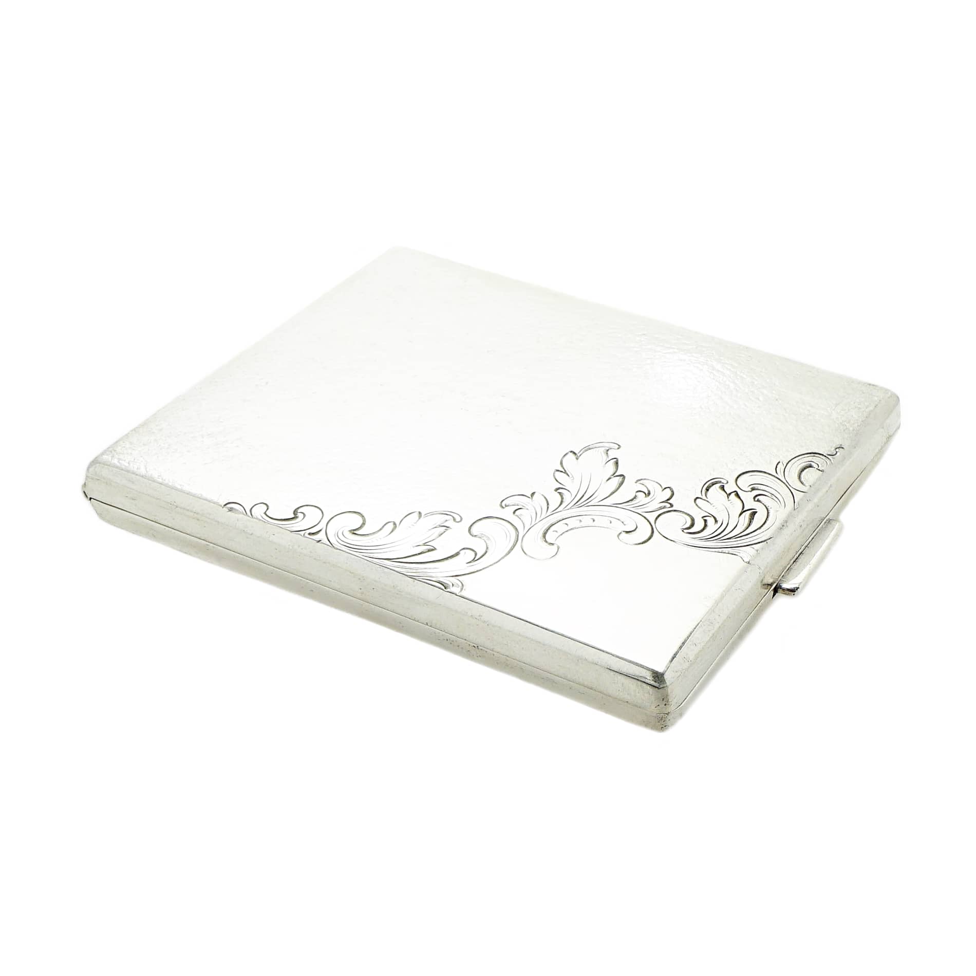 Zigarettenetui aus den 1930er Jahren mit Hammerschlagdekor, sehr fein getrieben und auf der Oberseite mit Rocaillen Dekor. Der Schließmechanismus funktioniert sehr gut.