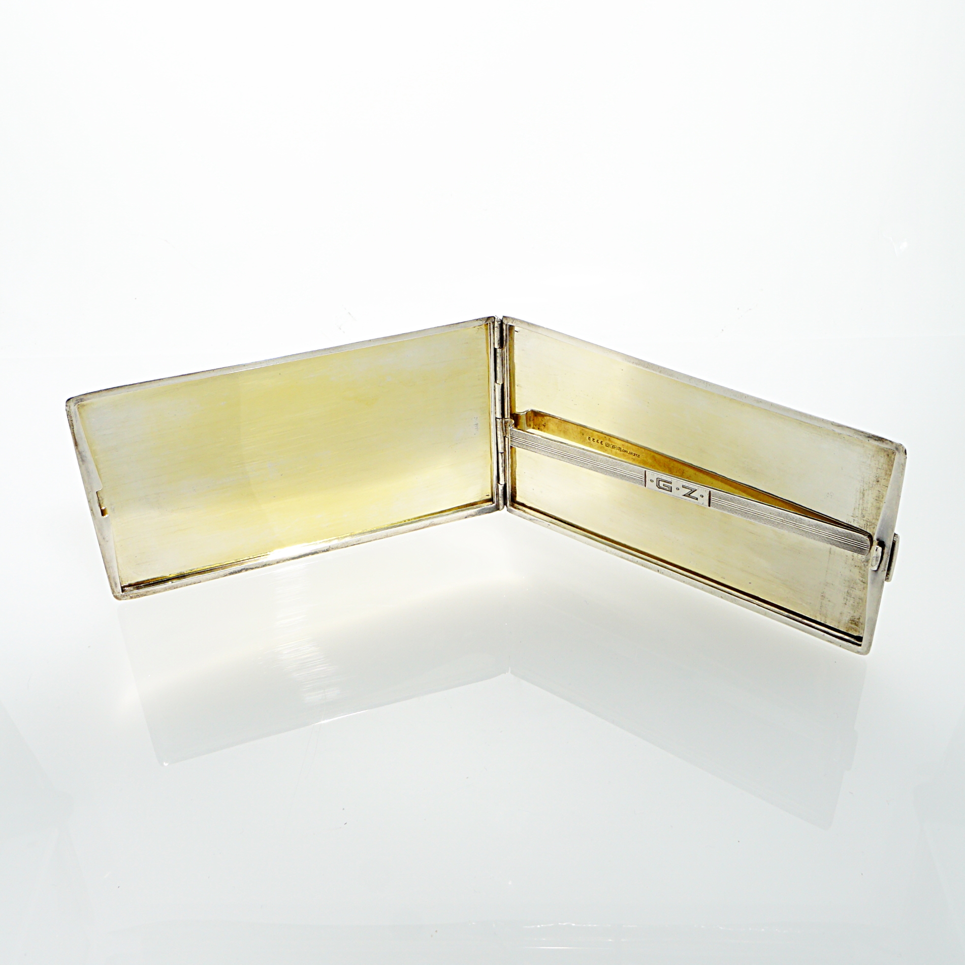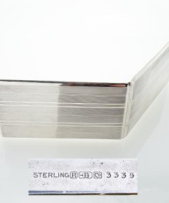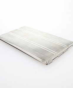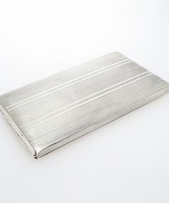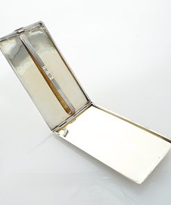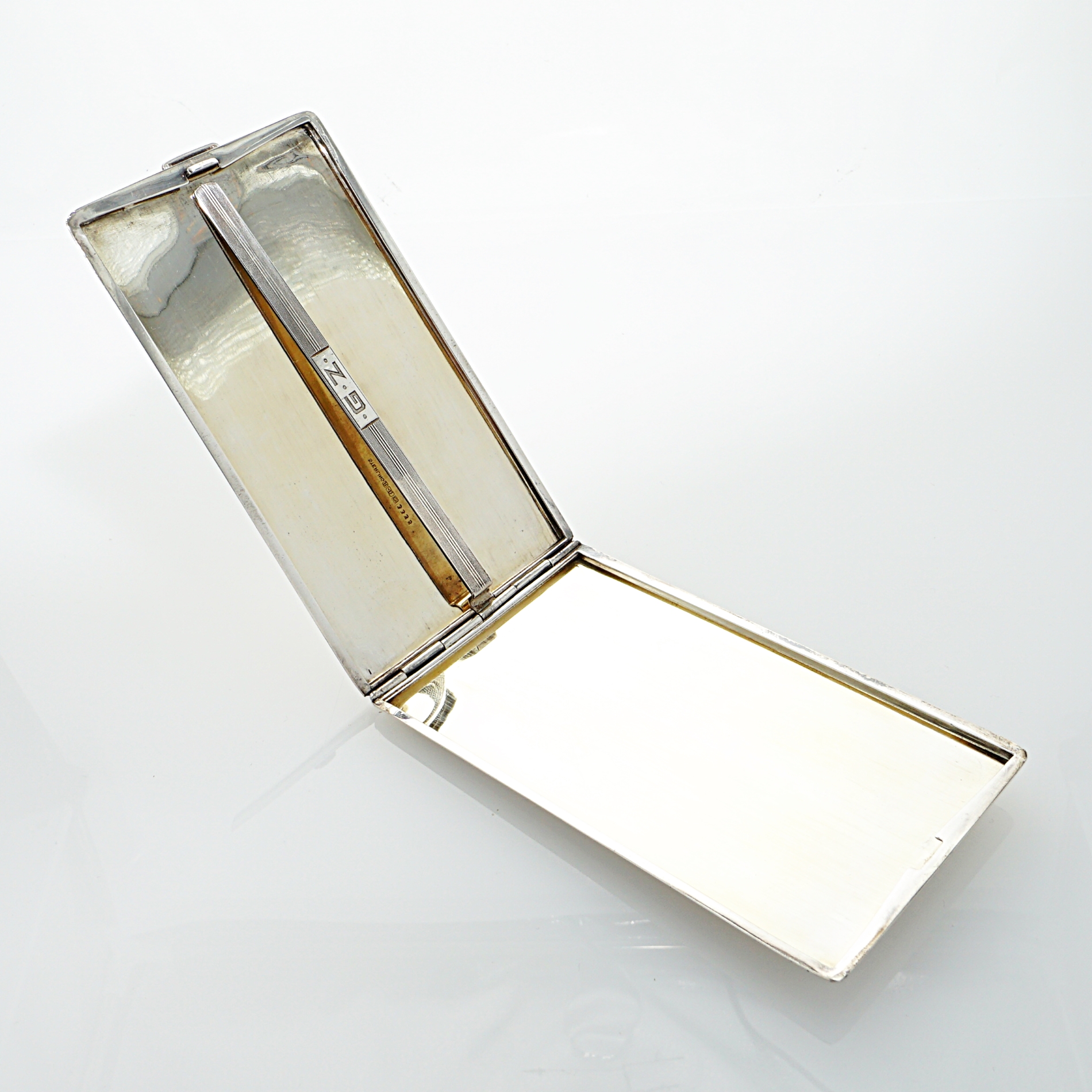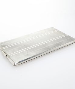 Großes Zigarettenetui aus der Silberwarenmanufaktur Roswell Blackinton & Co aus North Attleboro in Massachusetts / USA. Das Etui ist aus Sterling Silber gearbeitet, guillochiert, innenvergoldet und besitzt eine zentrale Haltespange mit Initialiengravur. Das Zigarettenetui wurde durch unseren erfahrenen Silberschmiedemeister restauriert.