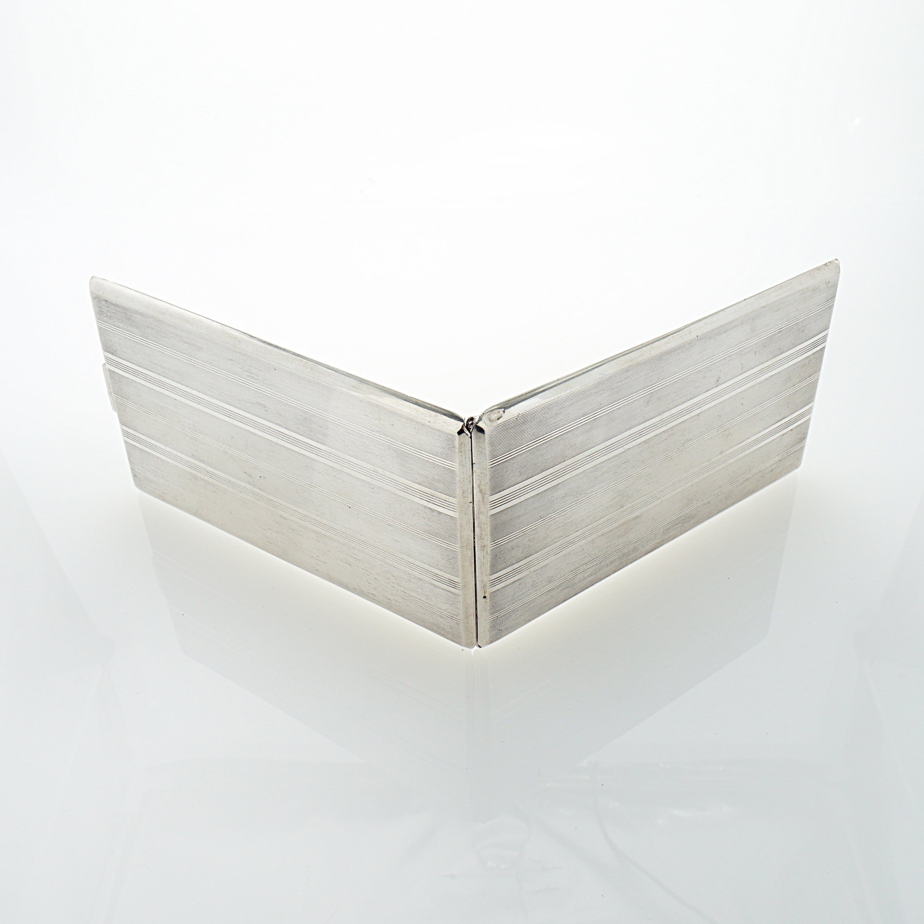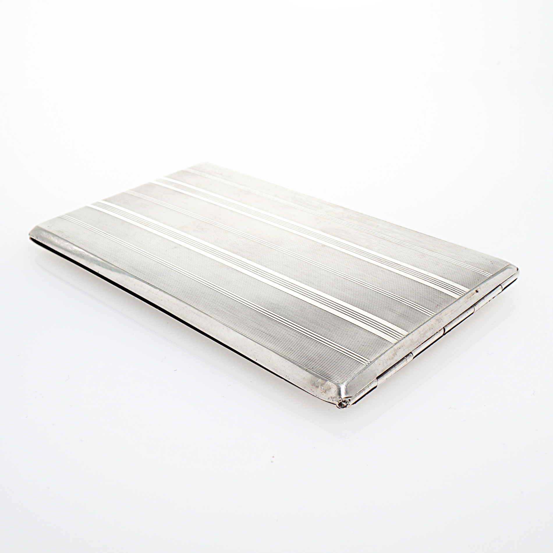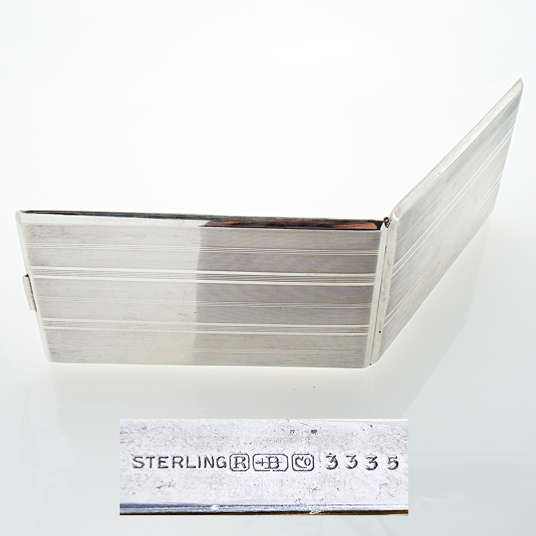 Großes Zigarettenetui aus der Silberwarenmanufaktur Roswell Blackinton & Co aus North Attleboro in Massachusetts / USA. Das Etui ist aus Sterling Silber gearbeitet, guillochiert, innenvergoldet und besitzt eine zentrale Haltespange mit Initialiengravur. Das Zigarettenetui wurde durch unseren erfahrenen Silberschmiedemeister restauriert.
